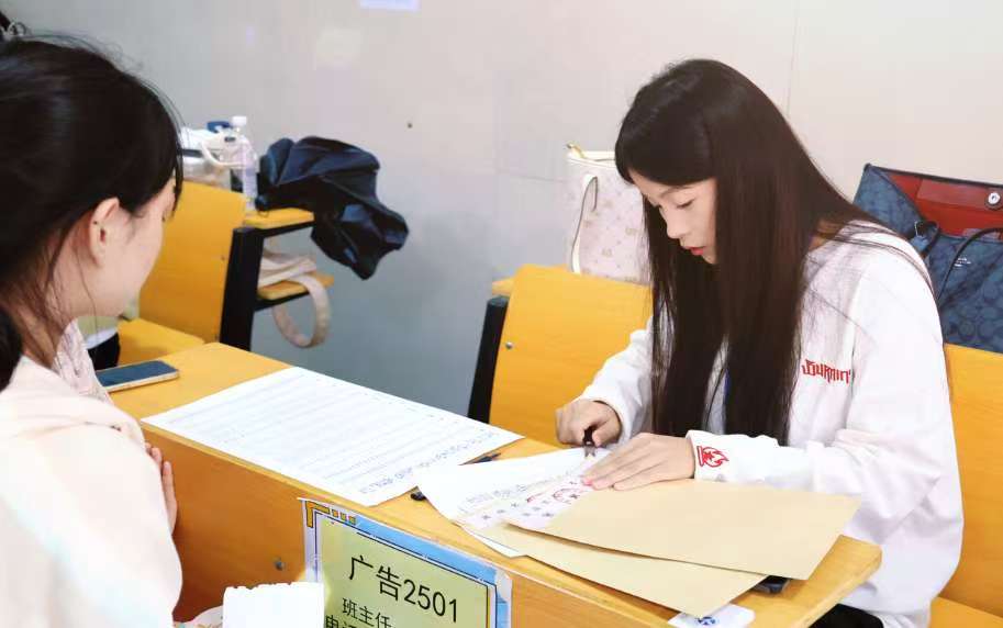 在报到点,学姐以细致的服务与温暖的姿态为新生梳理入学资料,为他们铺就大学逐梦的第一程,让入学的暖意悄然流淌在初秋的校园里,谱写着传承与温暖的迎新序曲。