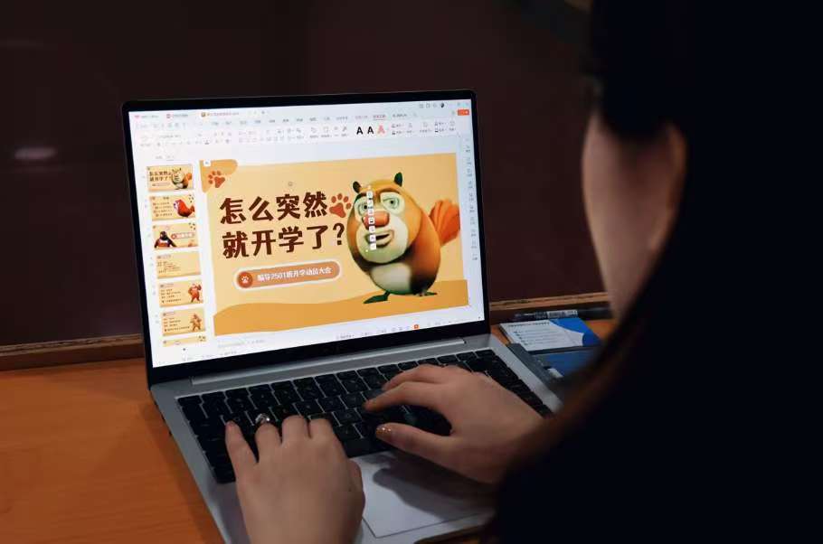 学姐指尖在键盘跃动,以灵动的PPT设计,让“怎么突然就开学了?”的萌趣设问,为新生动员大会绘就活力开篇,卡通形象与暖心提问交织,让开学序曲充满青春意趣。
