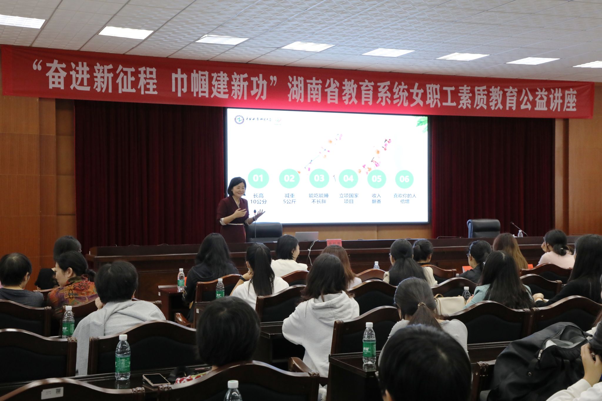 本网讯,10月18日,学校举行“奋进新征程,巾帼建新功”女职工素质教育讲座。优秀校友、党的二十大代表、中南林业科技大学袁红梅教授应邀来校作专题讲座,讲座由校工会常务副主席谢一民主持,工会全体工作人员及100余名女教职工代表参加讲座。
