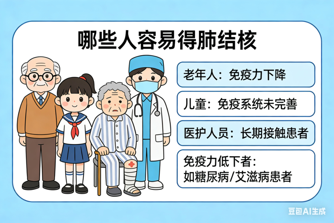 机体免疫力低下的人群是结核病的易感人群,例如婴幼儿、老年人、HIV感染者、免疫抑制剂使用者、糖尿病患者。另外,生活贫穷、居住拥挤、营养不良者易感染。