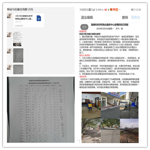 湖南科技学院的家属区,人员密集,学校教职工及退休老师较多,管理难度大,消杀工作是疫情防控工作的重中之重,两位同志带领物业团队与时间赛跑,从大年三十开始,每天都坚持在抗击疫情的第一线,安排并协助四位保洁员对全校45栋家属区楼道每日进行84喷雾消毒,每周对全校的260个垃圾桶进行3次消毒工作。并将341户居家隔离老师每日产生的生活垃圾从六楼逐层收下来放入垃圾桶内。