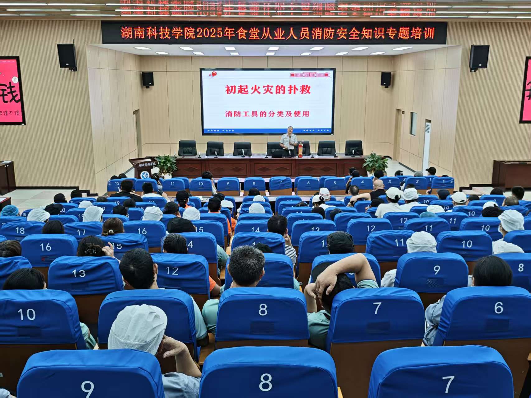 为进一步提高食堂从业人员消防安全意识,提升应急处置能力,2025年10月17日下午,后勤服务中心饮食服务部在明德楼101室组织开展了消防安全知识专题培训,学校全体食堂从业人员参加了培训。