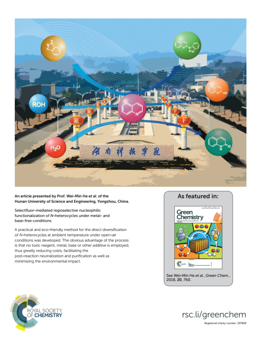 近日,国际顶级期刊Green Chemistry(影响因子9.125)发表了我院有机化学研究团队谢龙勇博士在绿色有机合成研究领域取得的最新研究成果。此项研究成果同时也被遴选为当期封底论文,并首次以我校标志性建筑潇湘广场为封底背景。