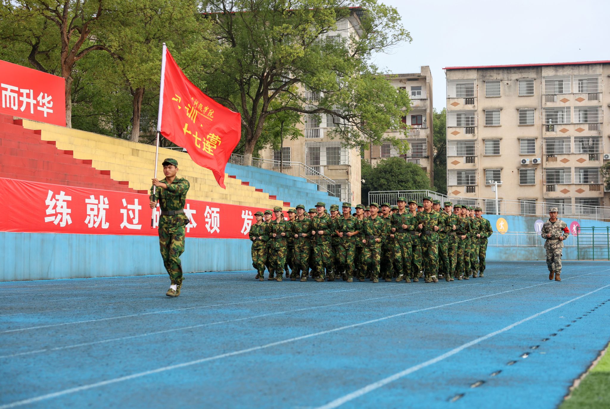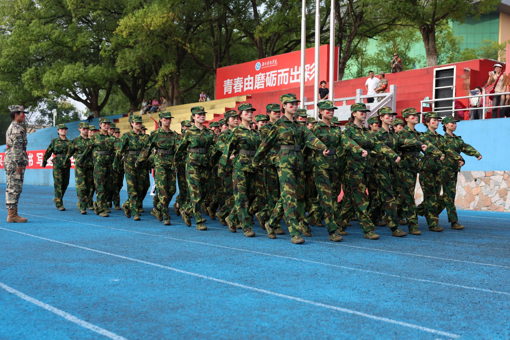 大会在庄严的国歌声中拉开帷幕。优秀连队方阵步伐整齐、精神抖擞地依次通过主席台,他们口号嘹亮、动作刚劲、目光坚定,充分展现了科院学子团结奋进、昂扬向上的精神风貌。