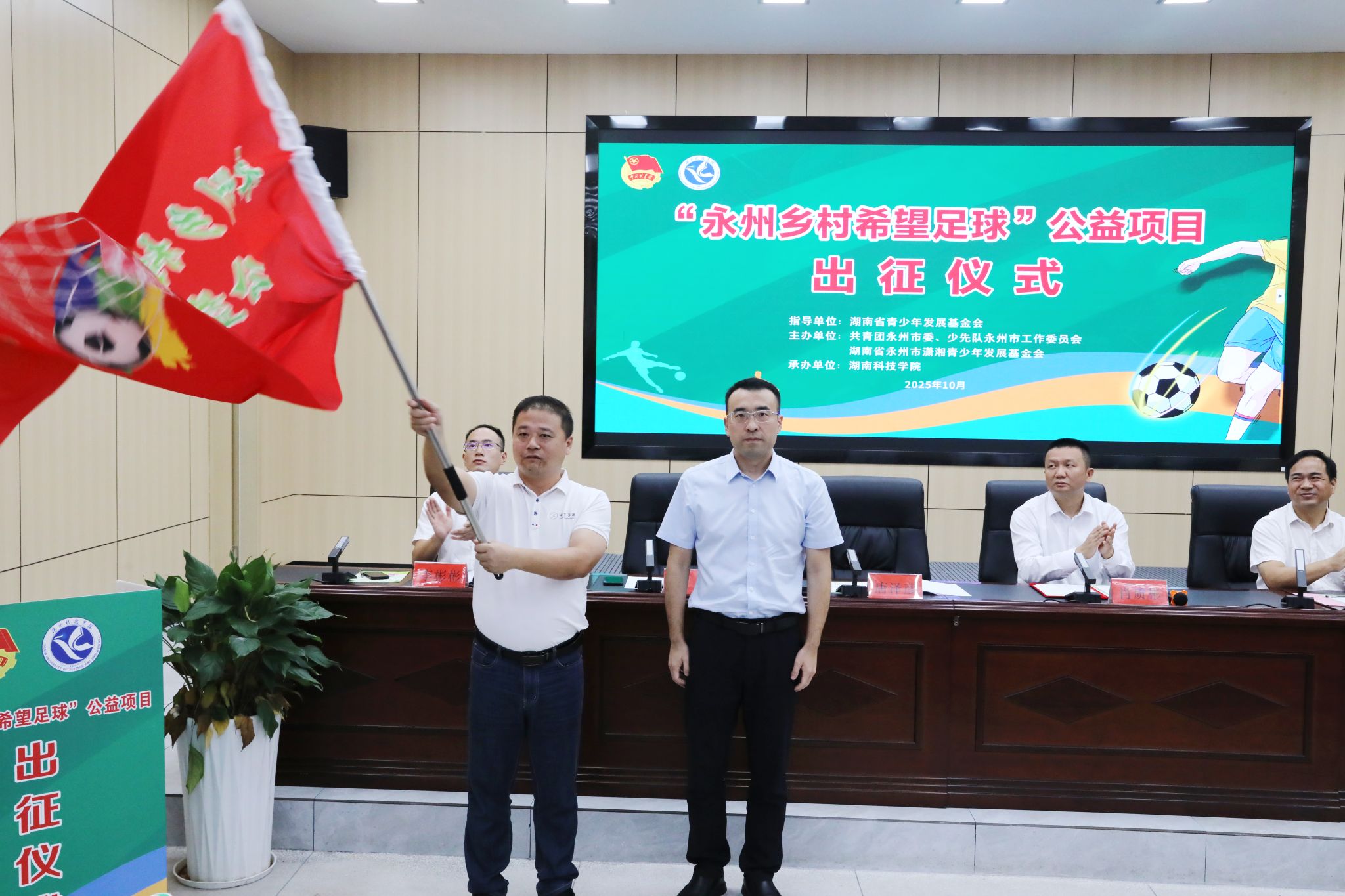 唐泽彦向湖南科技学院体育学院授“永州乡村希望足球”公益项目旗帜,李彬彬作了项目介绍,志愿者代表现场进行了宣誓。