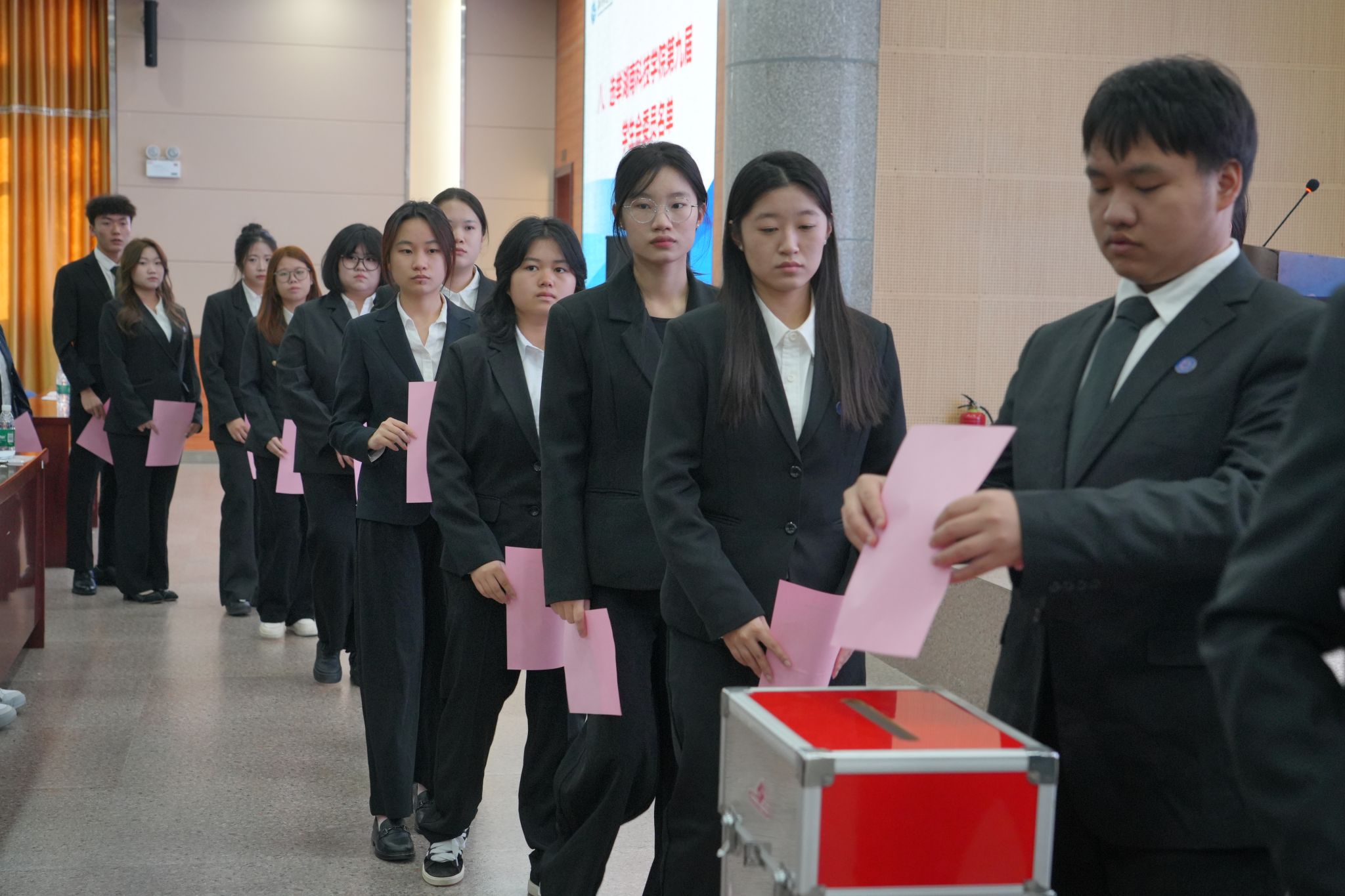 大会按照选举程序和办法,全体正式代表行使民主权利,公开进行投票,选举产生了学校第九届学生委员会委员及学生会主席团成员。其中,林嘉豪、郑永鑫、段天琼、高奕萱等20名同学当选新一届学生会委员会成员。