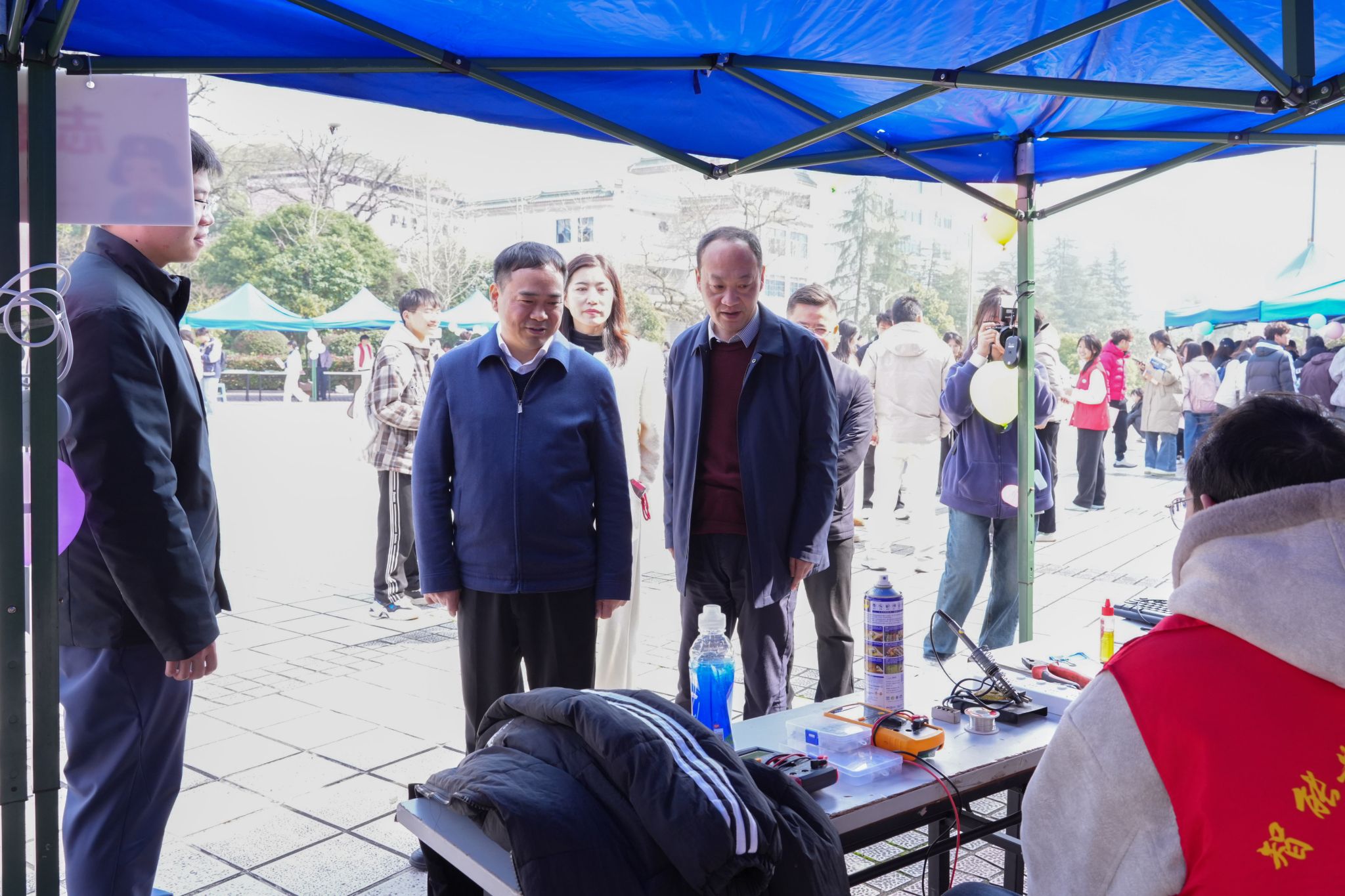 启动仪式后,黄创霞、杨涛等来到公益集市,与师生亲切交流。集市设置爱心义卖、志愿服务、文化体验、集章激励等区域,书法体验、健康服务、急救培训等活动吸引众多师生参与。义卖所得将用于帮扶困难学生和社区公益服务,现场还提供无偿献血报名登记。
