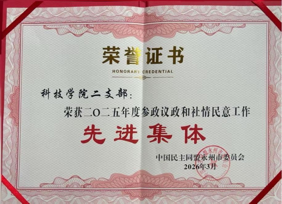 本网讯(通讯员 王星)3月25日,民盟永州市委六届八次全委(扩大)会议对2025年度盟务工作先进集体、先进个人进行表彰。民盟湖南科技学院一支部荣获“支部建设和组织工作先进集体”称号,民盟湖南科技学院二支部荣获“参政议政和社情民意工作先进集体”称号。