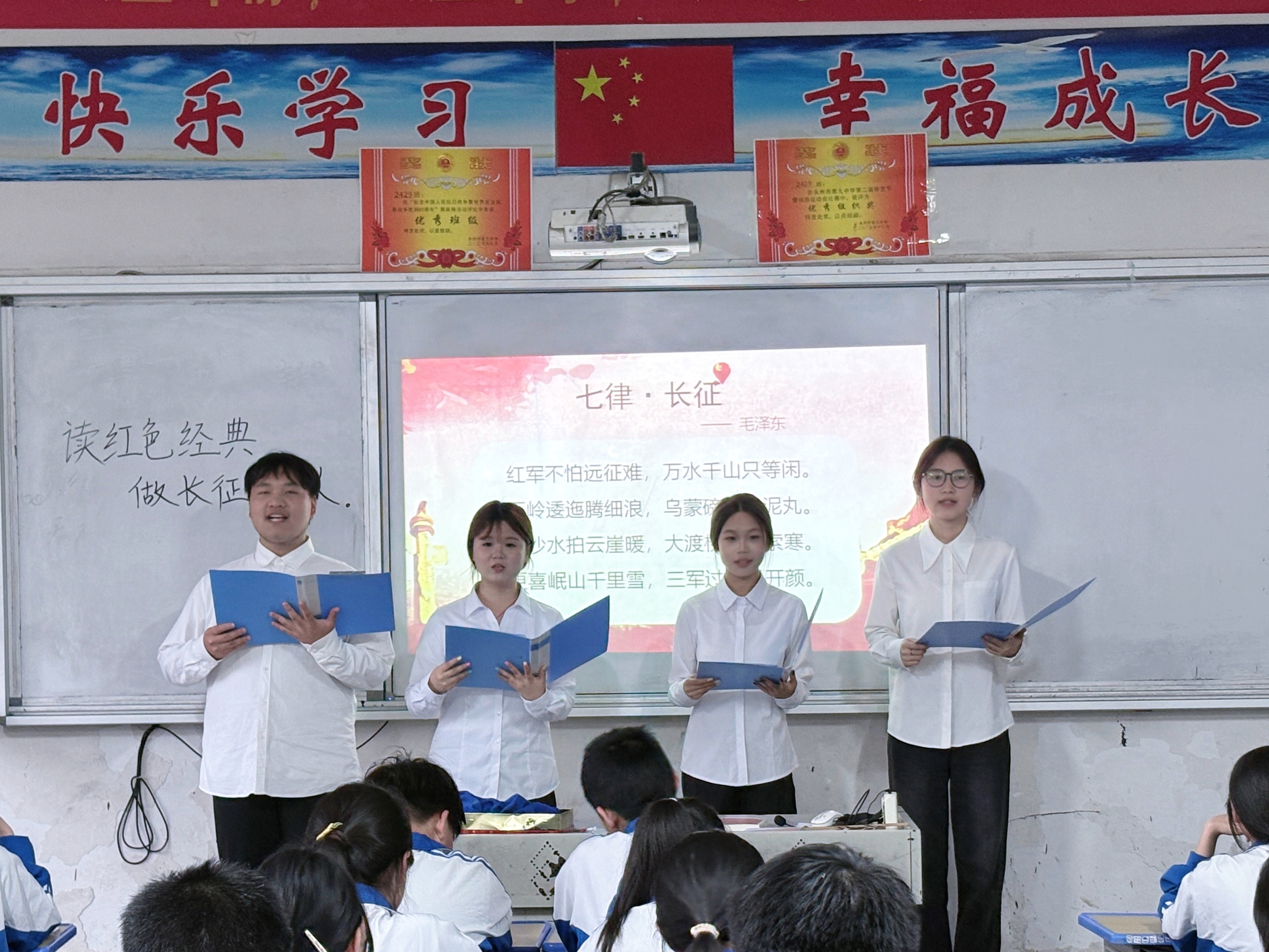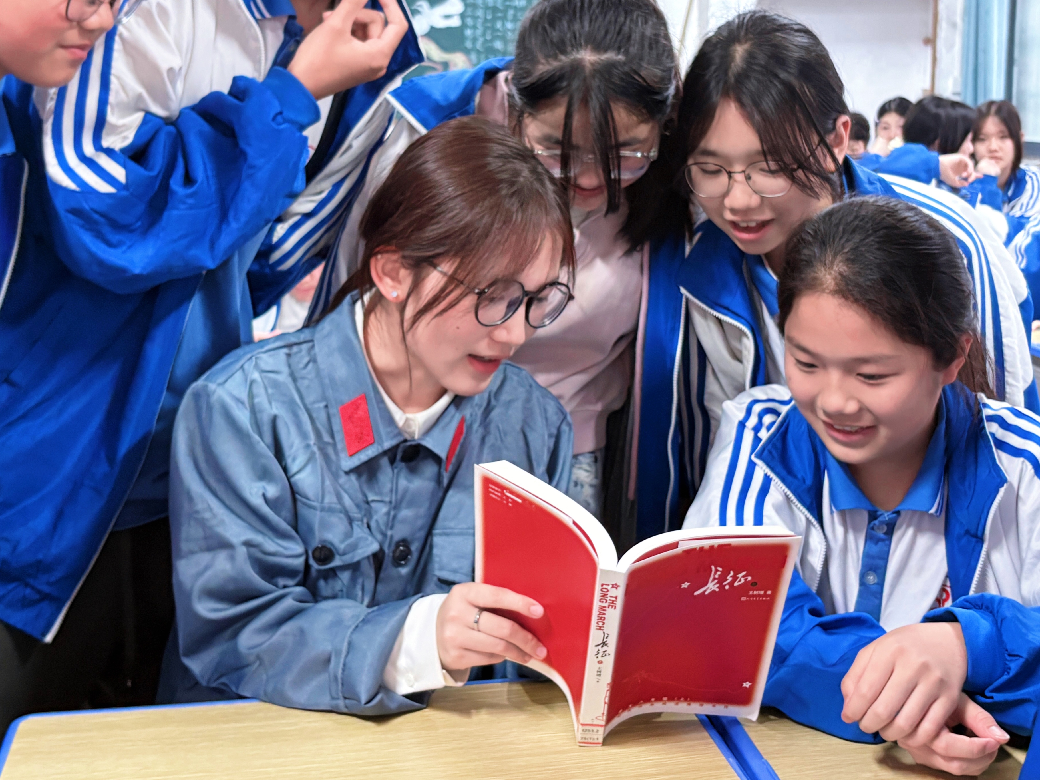“他倚着一棵光秃秃的树干坐着,一动不动,好似一尊塑像……”当《丰碑》的故事在课堂上响起,军需处长舍己为人的形象变得具体可感。随着志愿者动情的讲述,带领中学生们回顾了长征的感人故事。 故事未凉,诗声已起。“红军不怕远征难,万水千山只等闲……”当《七律·长征》的朗诵声整齐响起,这一刻,诗歌不再只是课本上的选段,而成了可共鸣的精神回响。