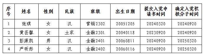 经党支部培养教育和考察,在听取培养联系人、党员和群众意见的基础上,经支部大会2026年3月25日召开会议讨论,拟确定张琪等4名同志为发展对象,报学院党总支审查。