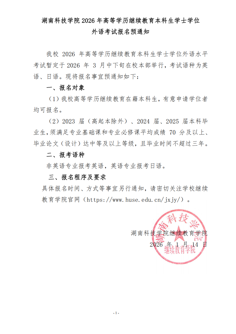 湖南科技学院2026年高等学历继续教育本科生学士学位外语考试报名预通知