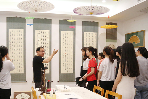 展出的一百多幅女书书法作品吸引了广大师生驻足观看,展览室里济济一堂,欧小松教授从女书的来源、发展过程以及女书文化的形成等方面进行了精彩的讲解,让听众们醍醐灌顶、受益匪浅。在互动过程中,一名来自甘肃的女生受到欧小松教授的表扬并被赠予了一幅女书书法作品。此外,现场还设有女书书法互动体验区域,参观者可以尝试练习女书书法,体验不一样的中国汉字书写,传承中国传统文化。