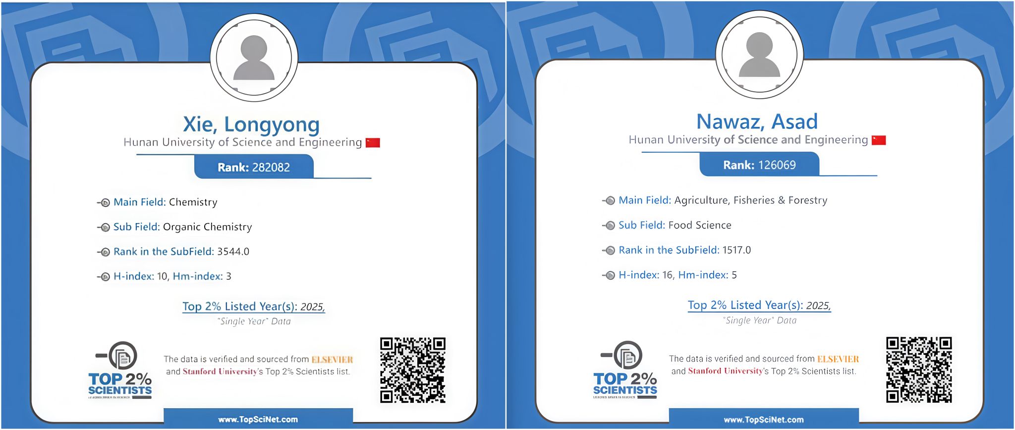 2025年9月,斯坦福大学与爱思唯尔(Elsevier)联合发布2025年“全球前2%顶尖科学家”榜单。我校三位学者入选,其中黄创霞教授入选“终身科学影响力排行榜”,谢龙勇博士与Asad Nawaz博士入选“2025年度科学影响力排行榜”。