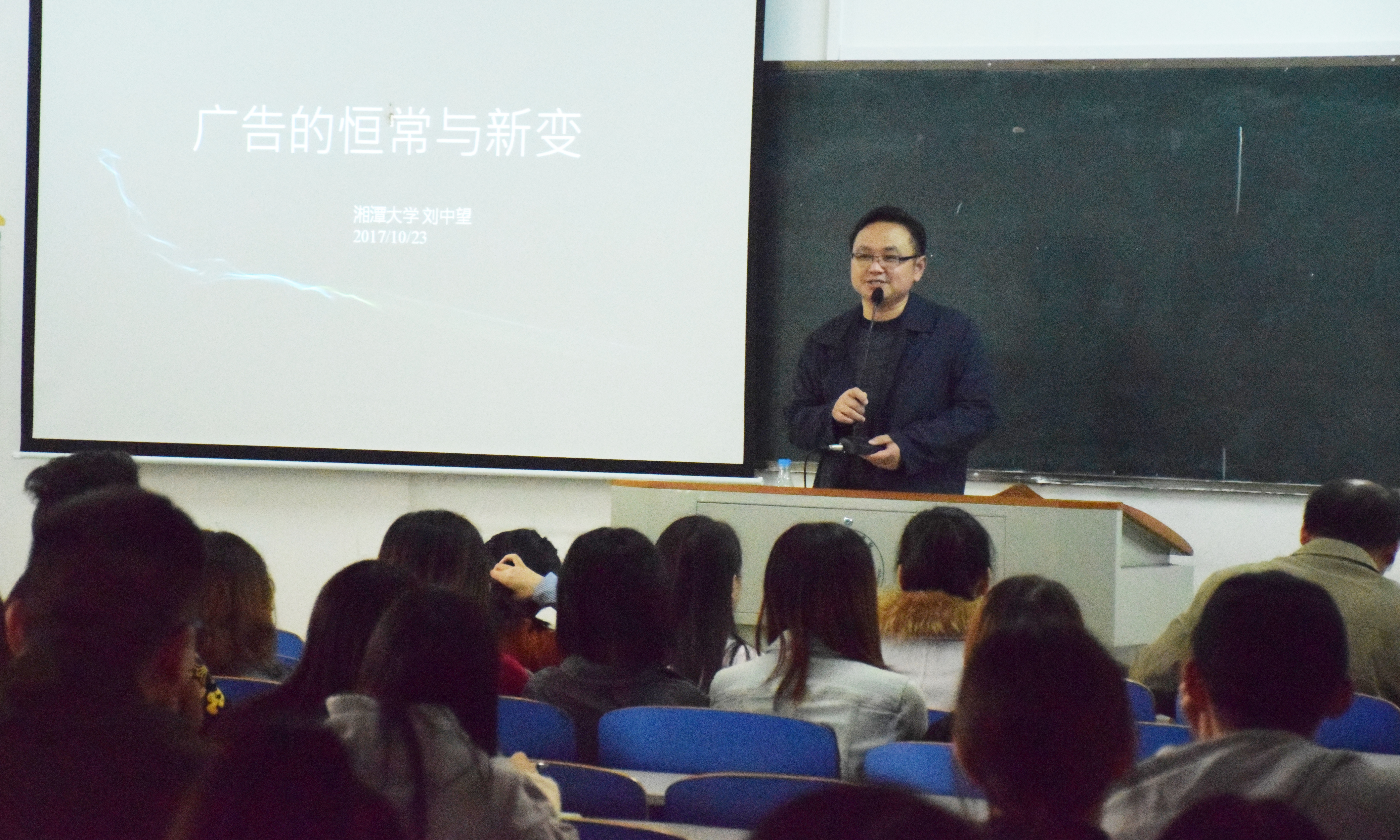 本网讯 10月22日,湘潭大学博士生导师刘中望教授应邀来我校为传媒学院师生作题为《广告与前沿》主题讲座,传媒学院广告专业师生聆听了讲座,传媒学院院长杨增和主持讲座。