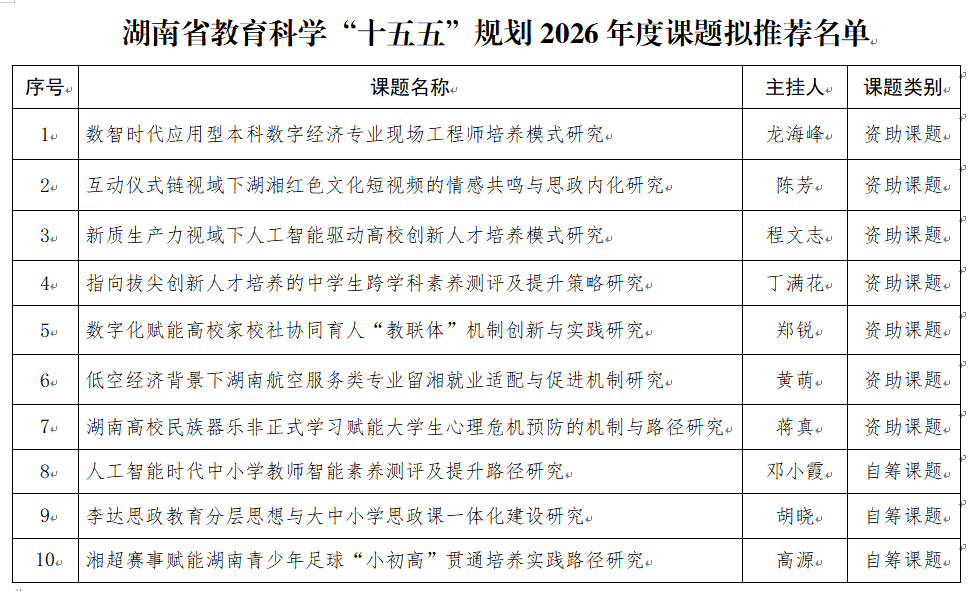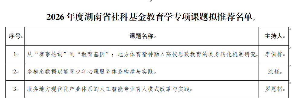 根据《关于做好2026年度湖南省社科基金教育学专项课题申报工作的通知》和《湖南省教育厅关于做好湖南省教育科学“十五五”规划2026年度课题组织申报工作的通知》精神,经自主申报、学院推荐、资格审查、通讯评审及会议评审,现对拟推荐申报2026年度湖南省社科基金教育学专项课题及湖南省教育科学“十五五”规划2026年度课题的名单予以公示。公示时间为2026年4月28日至30日。