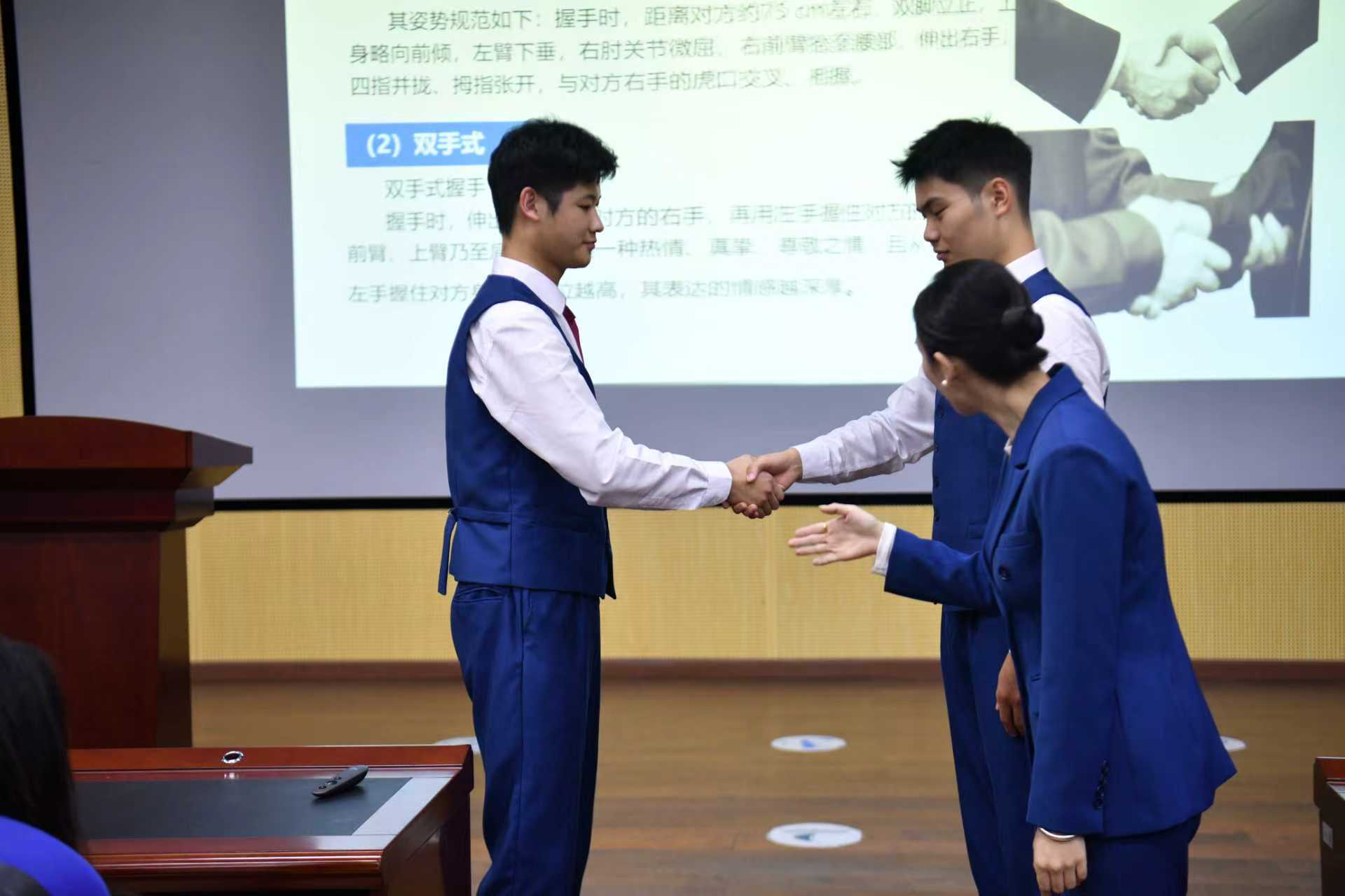 互动实践环节将讲座推向高潮。在龙老师指导下,学生们通过情景模拟亲身体验礼仪细节。从站姿坐姿到握手问候,从表情管理到语言表达,每一个细节都凝聚着礼仪的智慧。现场学子积极参与,在实践互动中深化了对“敬而后礼,礼由心生”传统礼仪精髓的理解。