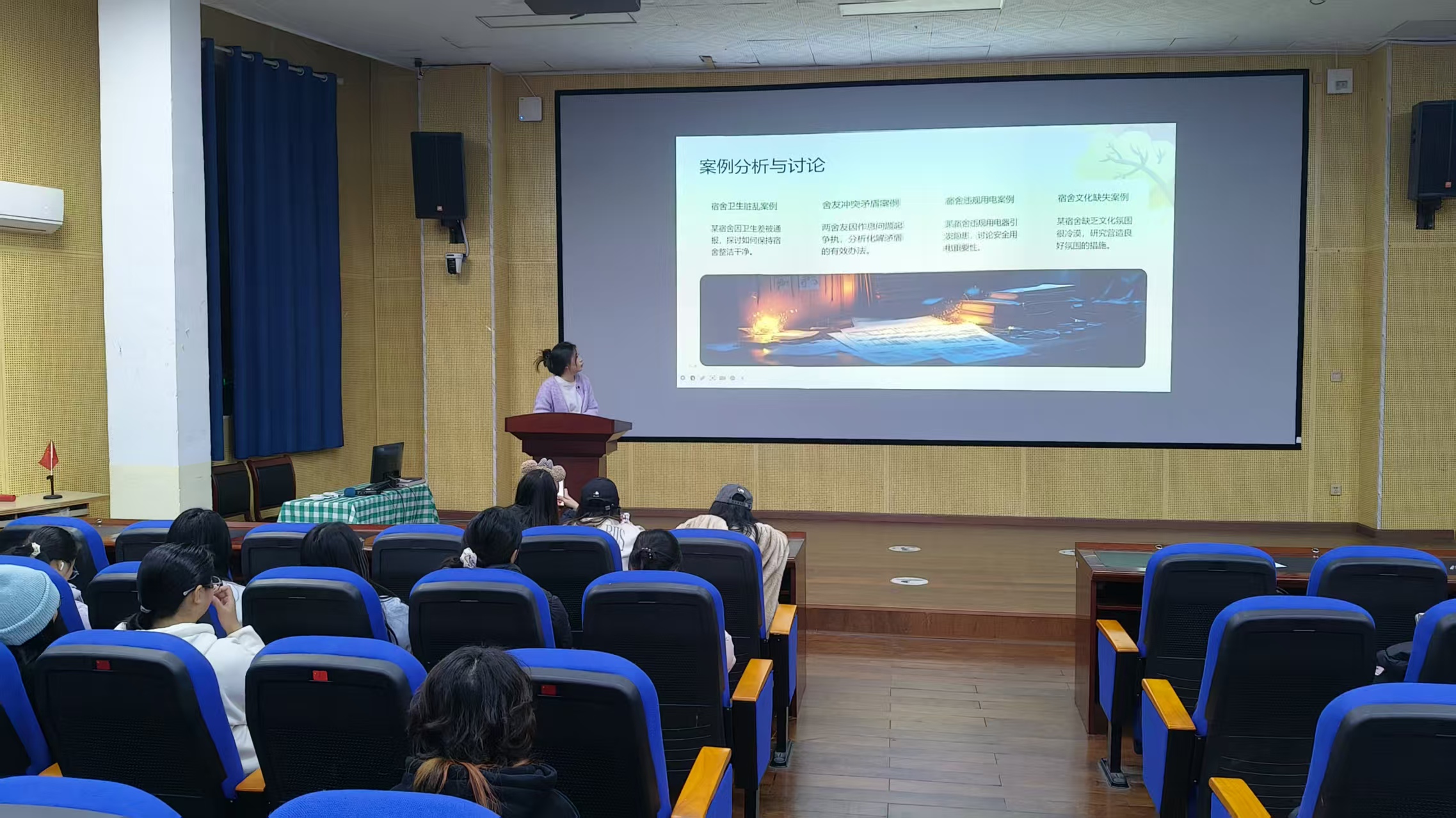 最后,主持人向全场同学发出倡议,号召大家将本次讲座所学的礼仪知识转化为实际行动,从整理个人内务、主动问候室友等细节做起,主动担当文明宿舍建设的实践者与推动者,共同营造整洁有序、互助友爱的住宿氛围。