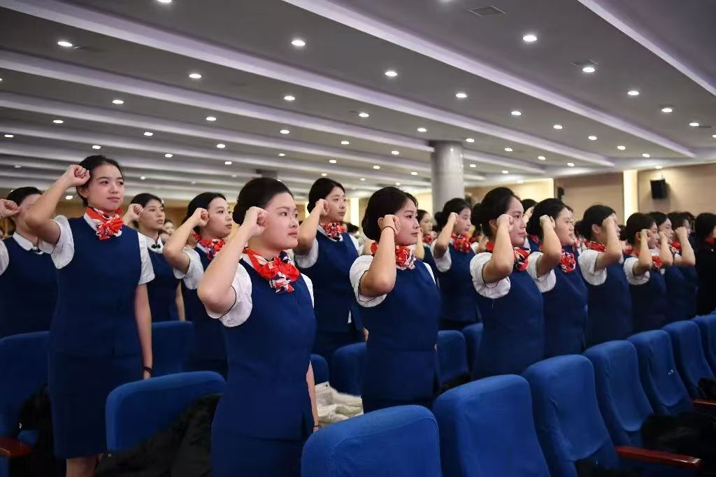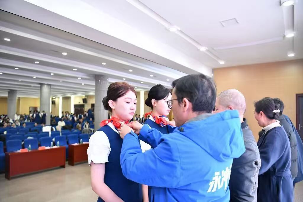 随后,大会举行了航空服务艺术与管理专业2025级新生制服授发仪式。新生们庄严宣誓,右手握拳,誓言铿锵,展现出对专业的热爱与对未来的坚定信念。