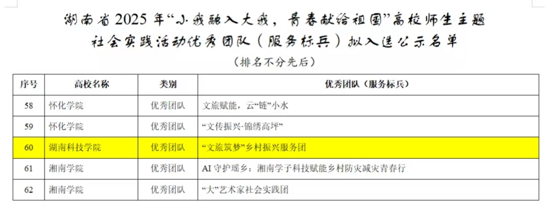 本网讯(通讯员:唐紫颖 周林馨雨) 在湖南省2025年"小我融入大我,青春献给祖国"高校师生主题社会实践活动优秀团队评选活动中,旅游与文化产业学院"文旅筑梦"乡村振兴团队成为全校唯一入选者。