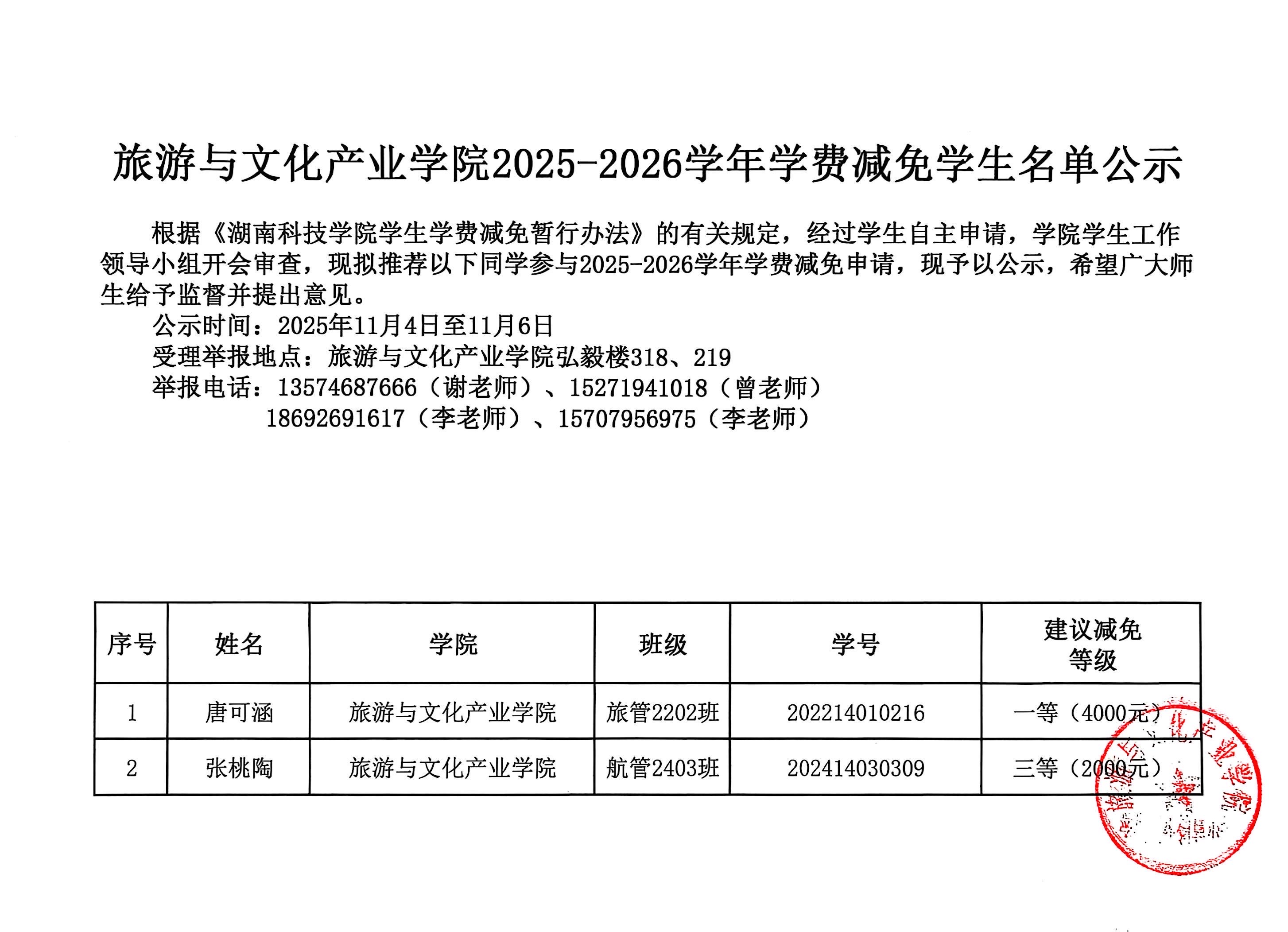 旅游与文化产业学院2025-2026学年学费减免学生名单公示