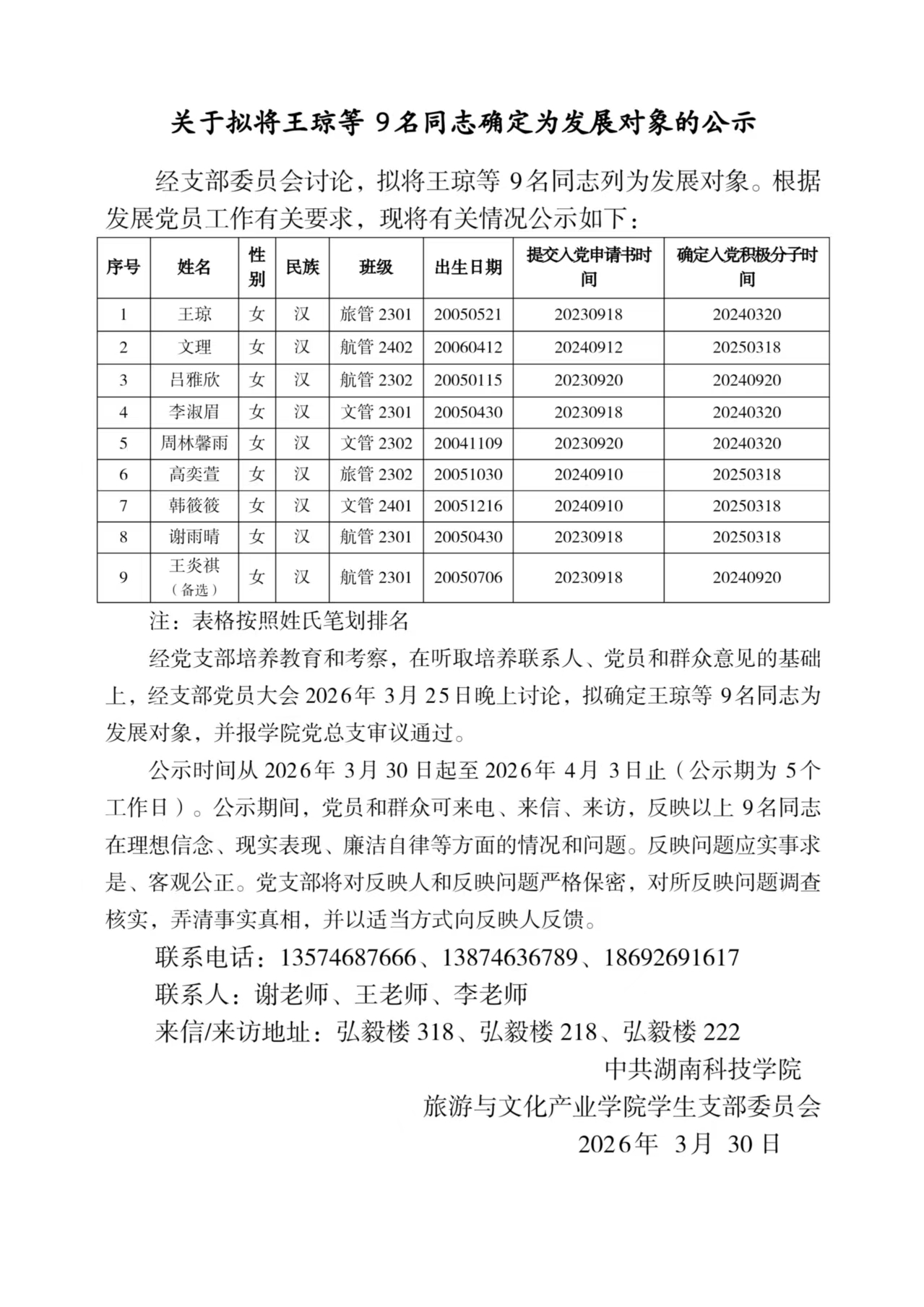 旅游与文化产业学院党总支2026年上期入党积极分子确定名单公示