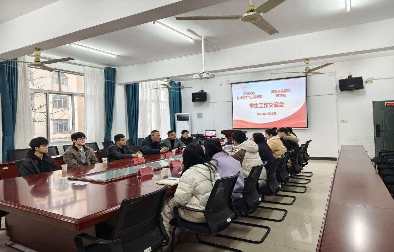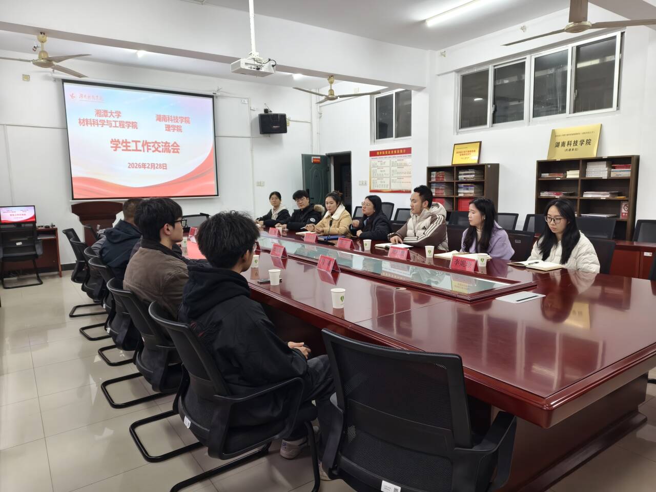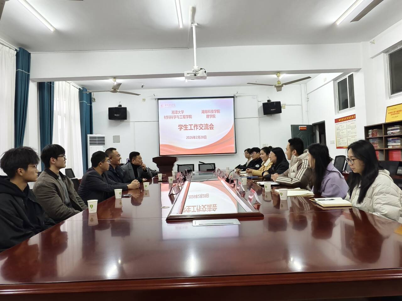 本网讯(通讯员 龙枚樱)2026年2月28日下午,湘潭大学材料科学与工程学院党委副书记罗兆祥、临武县教育局党委书记蒋宏峰一行来访湖南科技学院理学院,理学院党总支副书记欧阳素勤带领学工队伍接待并开展学生工作交流会。临武一中办公室主任杜庆新、湘潭大学相关辅导员及学生代表参与交流。