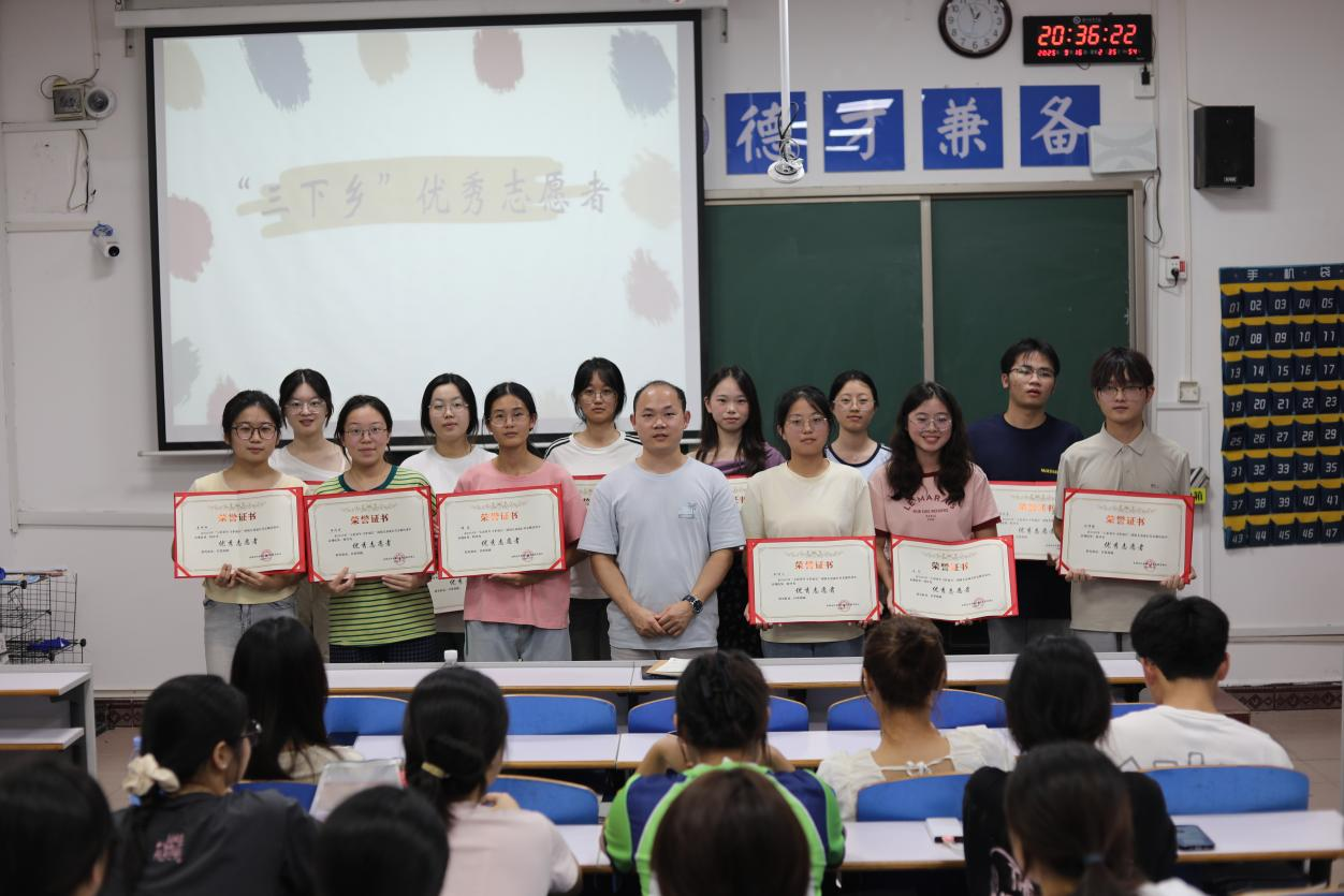 分享环节,同学们分享了“三下乡”实践之旅、参与返家乡社会实践以及假期社会兼职等实践经历。为期 10 天的 “三下乡” 实践之旅,不是一次简单的课外实践,而是一场集 “红色文化浸润、优秀传统文化传承、心理赋能、生活思政” 于一体的沉浸式成长盛宴。期间见证了一群农村困境儿童(7-16岁)的成长,也见证了同学们在实践中的成长。王玲同学讲述了自己从开始的担忧到学生的不配合,再到学生敞开心扉的“三下乡”经历,她表示:“这不仅是一次难忘的经历,更是一场满载温暖与成长的旅途,让我真正读懂了责任与坚守的意义”。向俾曦同学用生动的细节勾勒出与孩子们相处的美好日常。从带领孩子们学习刚劲有力的东安拳,感受传统文化的魅力;到精心设计趣味课堂,用知识点亮孩子们的眼睛;再到一起编排话剧,在欢声笑语中拉近心与心的距离。他表示“看着孩子们脸上纯真的笑容,我才明白,这场实践不是我们单向的付出,而是我们与孩子们双向的治愈与成长”。 接下来,吴志伟为假期“三下乡”社会实践中的优秀志愿者颁发证书,以表彰他们在实践中的优秀表现与积极贡献,进一步激发同学们参与实践的热情。