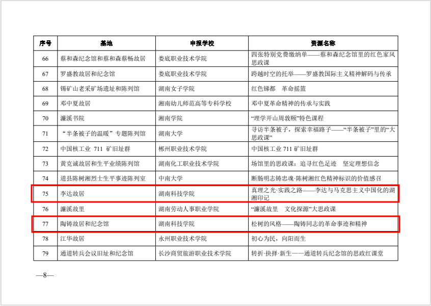 本网讯(通讯员 吴志伟)近日,省委宣传部、省教育厅和省文物局联合公布了2025年度以“红色资源”为主题的“大思政课”优质教学资源遴选结果的通知,我院牵头报送的“真理之光·实践之路——李达与马克思主义中国化的湖湘印记”和“松树的风格——陶铸同志的革命事迹和精神”两项重点项目凭借鲜明的红色主题、扎实的实践成效,双双成功入选。