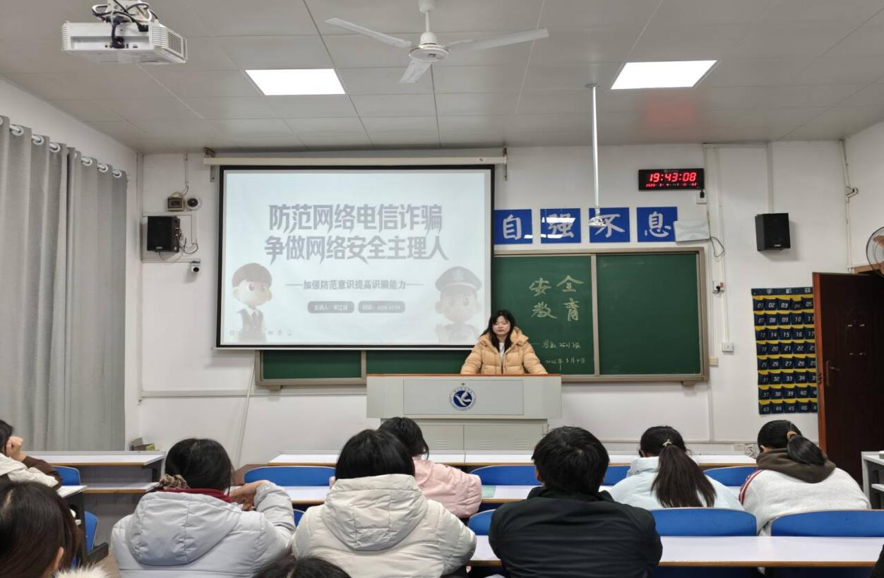 班会围绕开学季校园安全重点,结合典型案例,讲解宿舍用电、交通安全等实用知识;重点剖析刷单返利、校园贷等电信网络诈骗常见手段;普及识别与应对技巧,引导学生警惕诈骗陷阱、谨慎网络交友,强化自我保护意识。