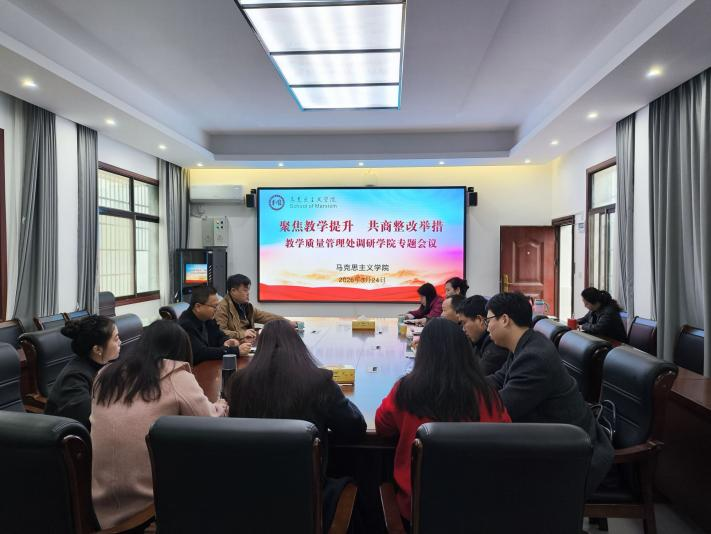 本网讯(通讯员 易佩)为深入落实学校审核评估专家意见及巡视整改工作要求,扎实推进校院两级教师发展联动提质,全力破解课堂教学突出问题,3月24日上午,马克思主义学院在鹤鸣楼405会议室召开校院两级教师发展联动提质与课堂教学整改调研会。教学质量管理处相关负责人、学院分管教学副院长、各教研室(系部)主任及学院督导等人员参会,会议有序高效推进。