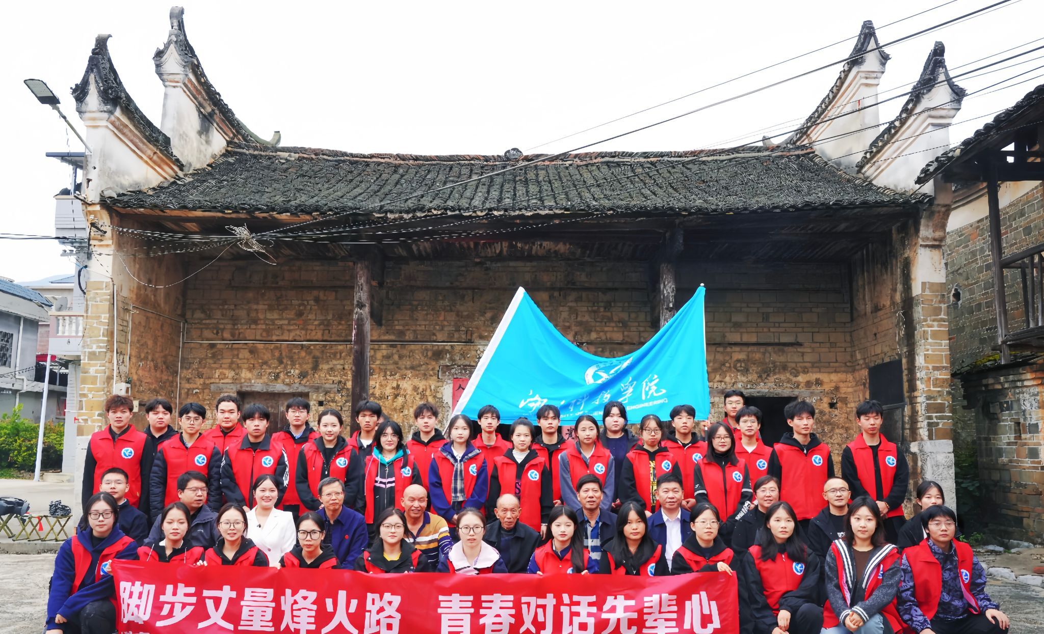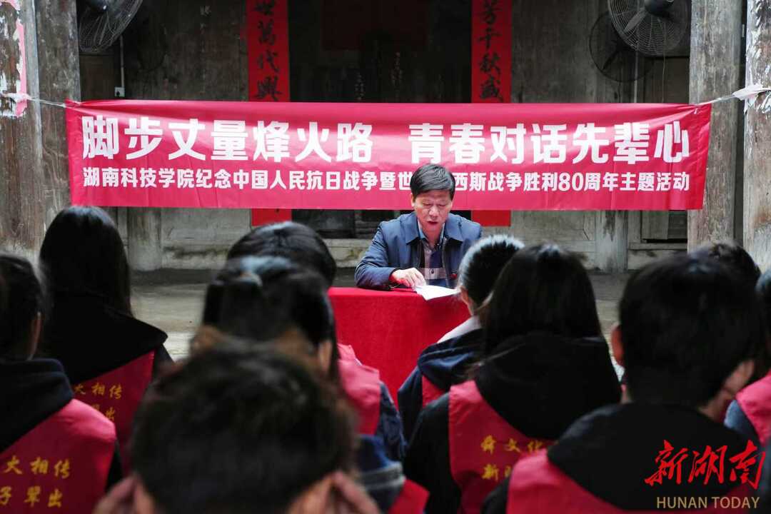 宁远县湾井乡麦地村黄家宗祠——湖南科技学院前身湖南省立第七师范学校抗战时期南迁办学旧址。潘剑锋教授在此以《树立“三个不相信”才能战无不胜》为题,带领学子回顾那段烽火办学的艰辛历程。他系统讲述了1944年日寇进犯道县后,七师师生毅然“举校南迁”,辗转宁远麦地村等地,在古庙祠堂中赓续教育火种的感人历史。