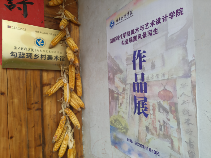 2025年11月10日,在美艺学院师生共同筹划和努力下,湖南科技学院风景写生作品展在“勾蓝瑶寨乡村美术馆”正式开展。此次展览旨在将高校教学成果留存于乡村,转化为持续的公共文化资源,直接服务于地方文化建设与旅游发展,真正实现了“将课堂开在乡野,把美留在乡村”,探索出艺术赋能乡村振兴的可循路径。展览吸引了众多游客和当地乡民的关注和参观,获得了大家的一致好评。