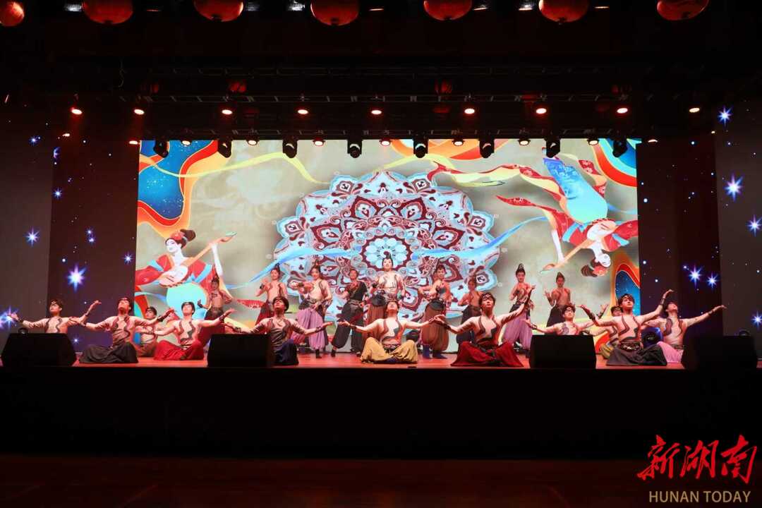 湖南科技学院学子带来的舞蹈《Fire》点燃全场,以蓬勃朝气展现青春的热烈与张扬;音乐与舞蹈学院学子演绎的舞蹈《铅华·满壁》,以婀娜之姿勾勒敦煌岁月,传递出深厚的文化底蕴。歌曲《阳光路上》《永冲锋》以激昂旋律致敬奋斗精神与家乡情怀,将现场气氛推向高潮。最终,晚会在全体演员与观众共同唱响的《相亲相爱》中圆满落幕。