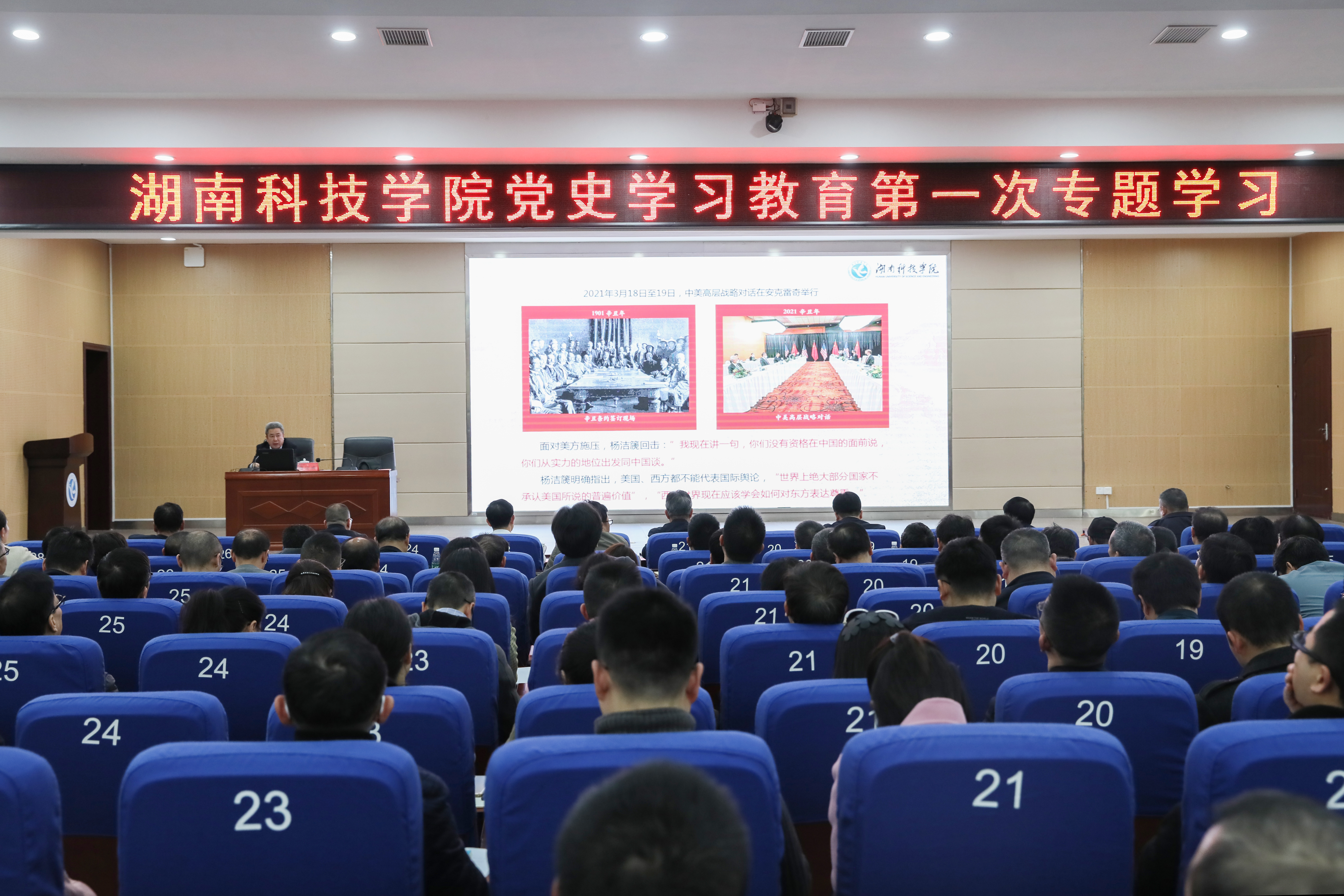 本网讯 3月25日下午,学校召开党史学习教育动员大会暨第一次专题学习。党委书记、校党史学习教育领导小组组长曾宝成作动员讲话。党委副书记、校长李钢主持。党委领导班子成员、全体中层干部、各基层党支部书记、党员代表参加大会。