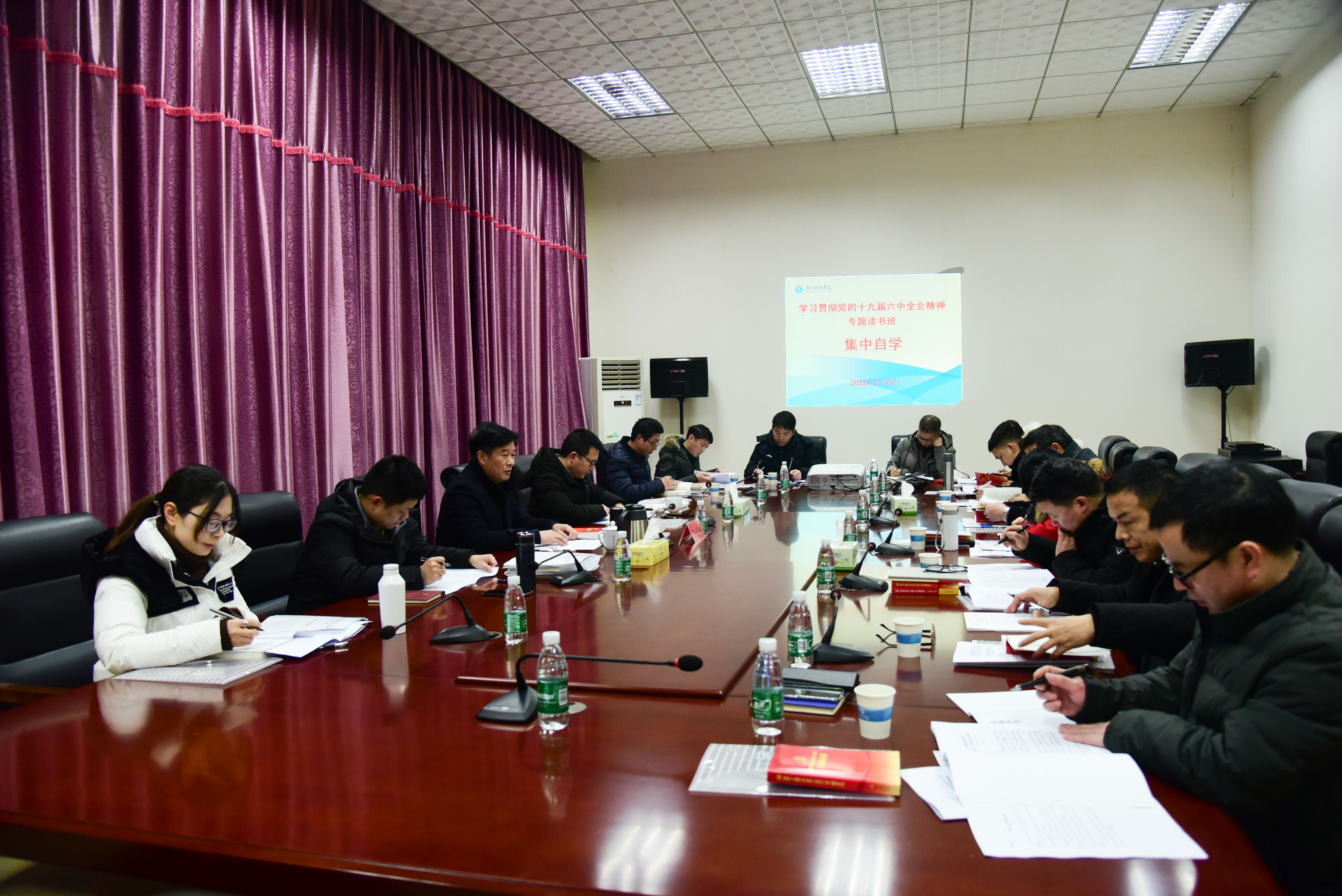 本网讯 2月22日下午,校领导及中层干部学习贯彻党的十九届六中全会精神专题读书班开班,党员干部分组开展集中自学,读原著、学原文、悟原理,原原本本学、原汁原味学,全校上下迅速兴起学习宣传贯彻全会精神的热潮。