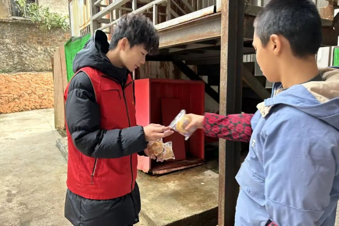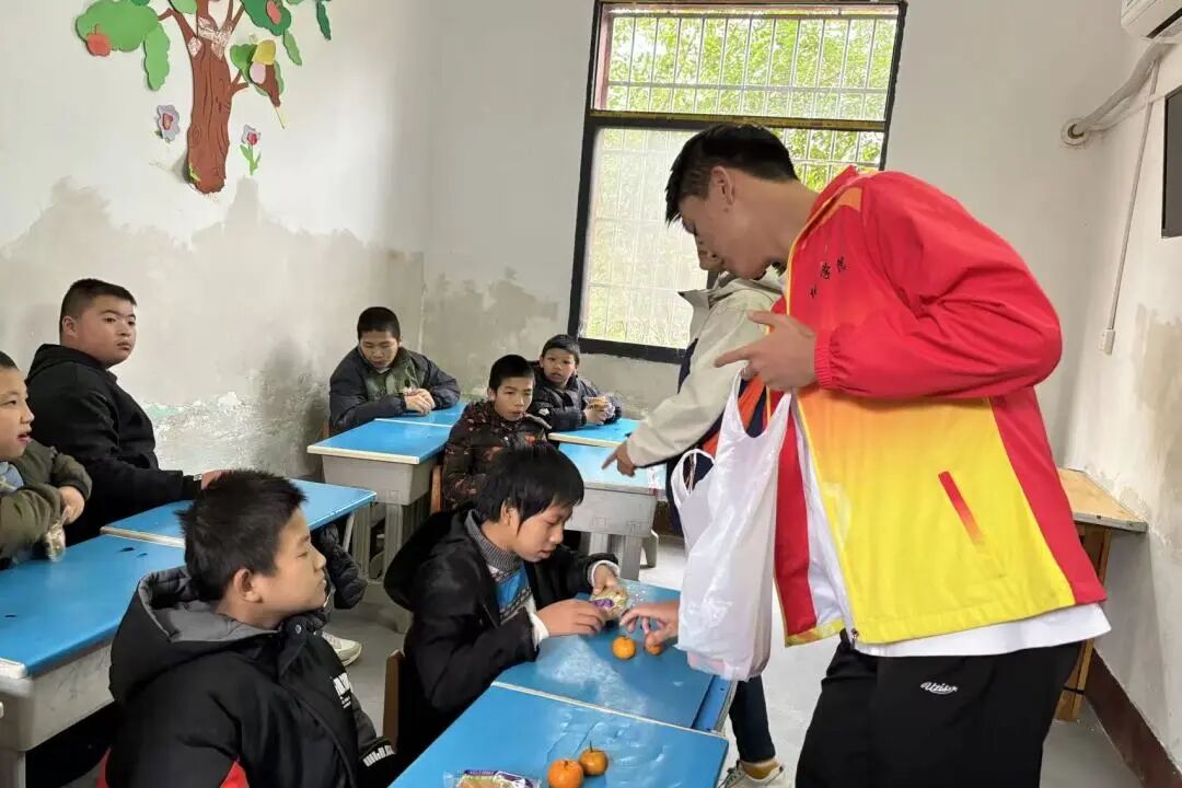 3月14日,体育学院志愿者团队走进乡村小学,开展“爱心助学”志愿服务活动。志愿者们身着红黄渐变外套,为孩子们分发橘子、面包等食品,并耐心询问学习生活等情况。
