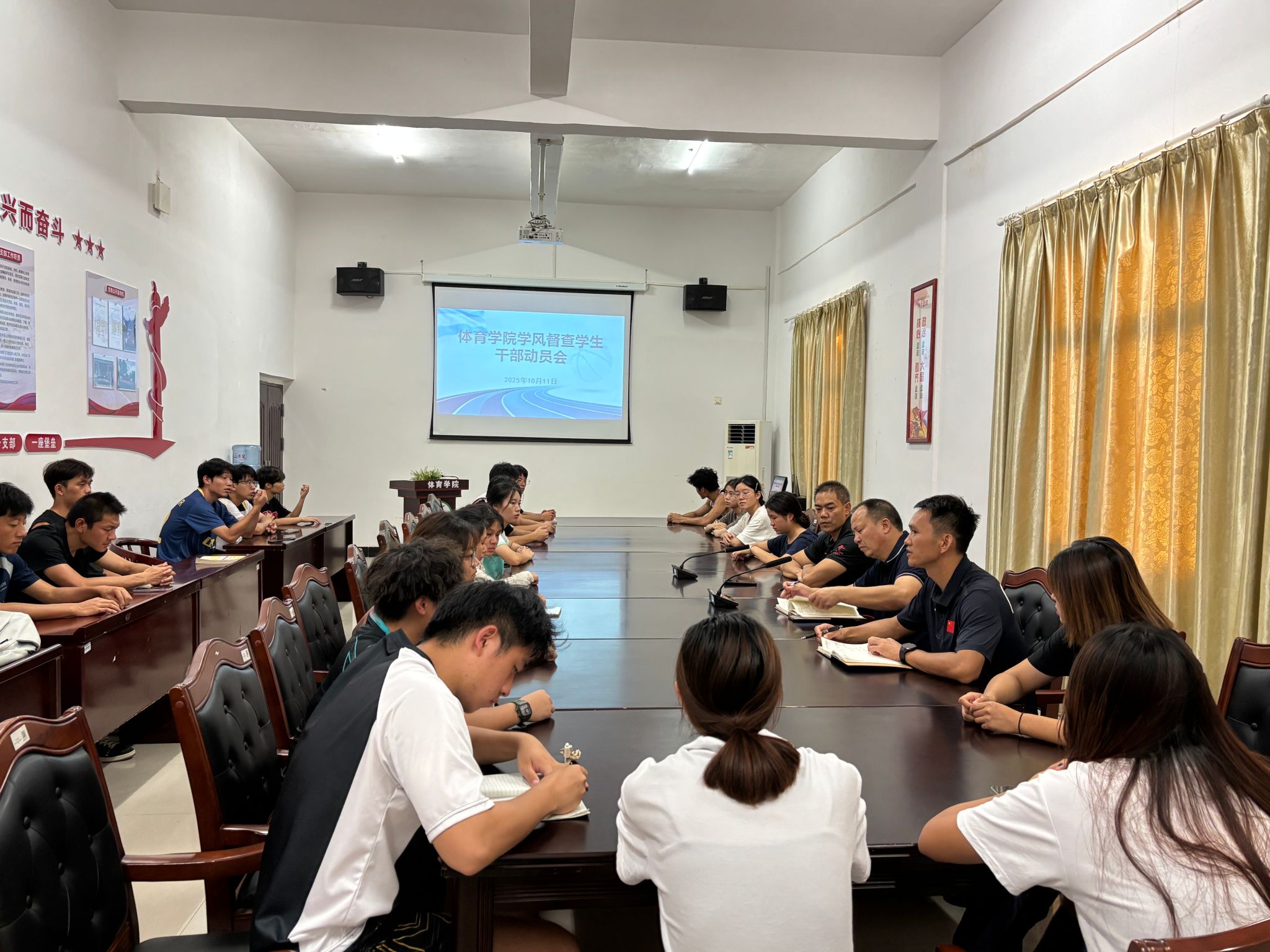 本网讯(通讯员 陈小峰) 为全面落实学校本科教育教学评估工作要求,切实加强学风建设,营造积极向上的学习氛围,体育学院于10月11日组织召开了学风督查专项工作推进会。学院副院长李红云,副书记刘华剑,辅导员陈小峰及班干部参加会议。