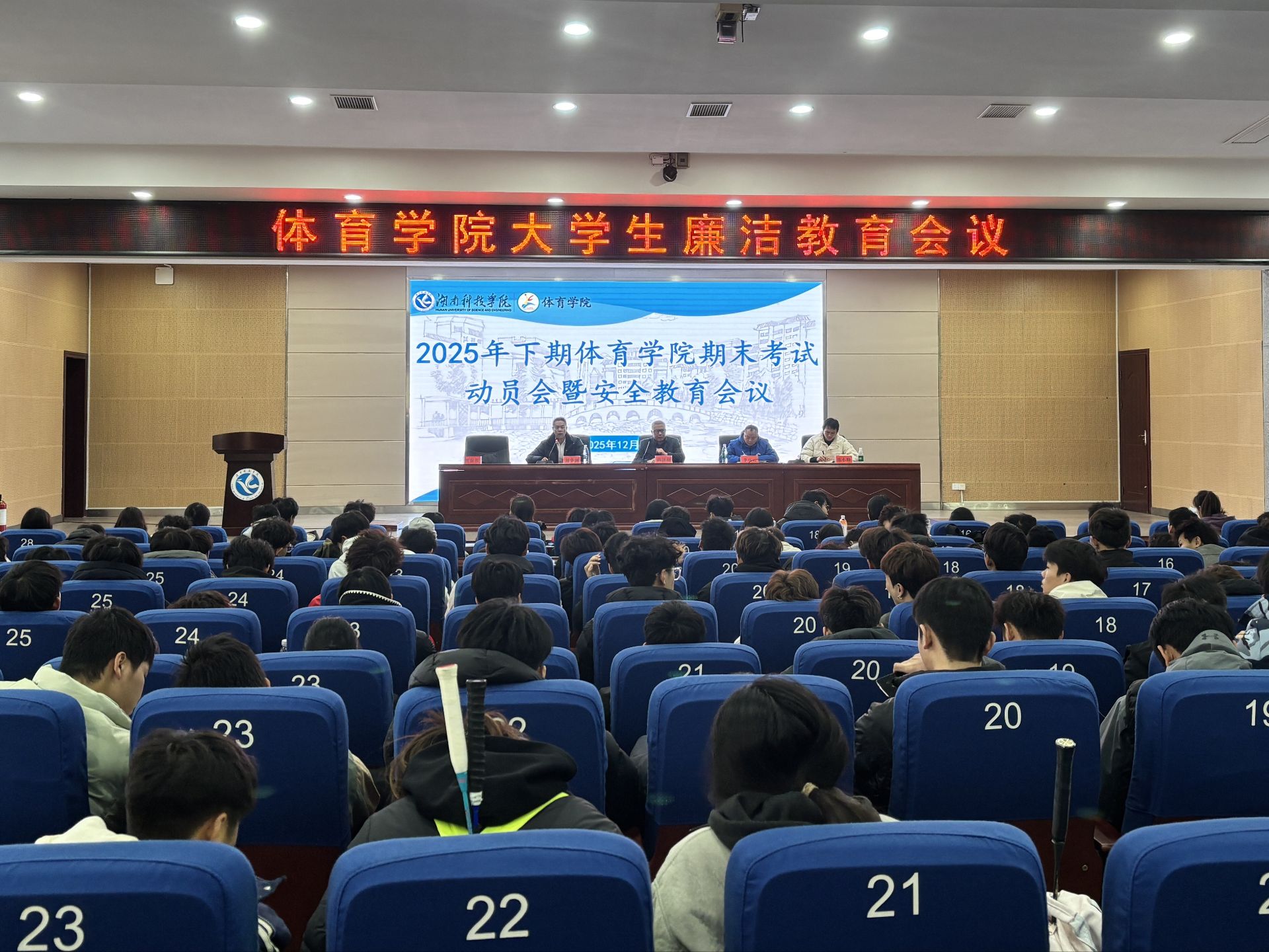 本网讯(通讯员 贺容容)12月25日,体育学院在潇湘大讲堂召开2025年期末诚信教育与安全教育大会。学院党总支书记陈泽顺、副院长李红云、党总支副书记刘华剑、全体辅导员出席会议,全体学生参加会议。