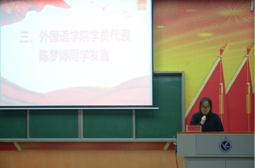 外国语学院商务英语2102陈梦婷作为学生代表发言,她号召同学们认真学习党的有关知识,承担起青年的责任与使命。最后,王艺老师宣讲了培训纪律,她希望广大学员做到思想重视,勤于思考,认真学习相关材料,争取最大收获。