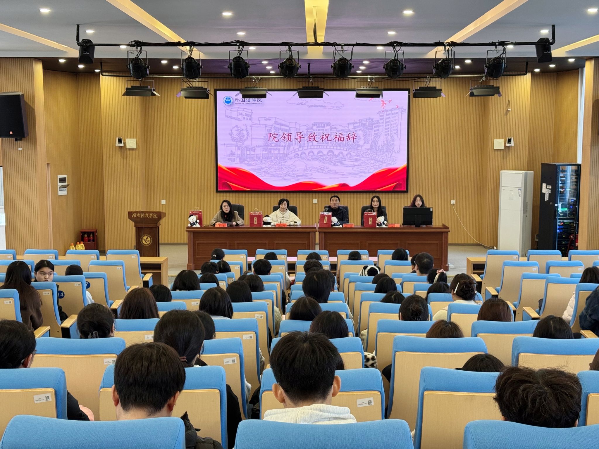 2025年12月16日下午,湖南科技学院外国语学院在博雅楼东三教室举办“考途顺遂,抵达研岸”考研助力活动。外国语学院院长何丽萍、党总支书记唐君、党总支副书记罗晶、副院长胡维以及全体辅导员、班主任共同出席,为即将奔赴考场的70名考研学子送上精心准备的“考研能量包”,以实际行动传递学院的深情牵挂与坚实支持。