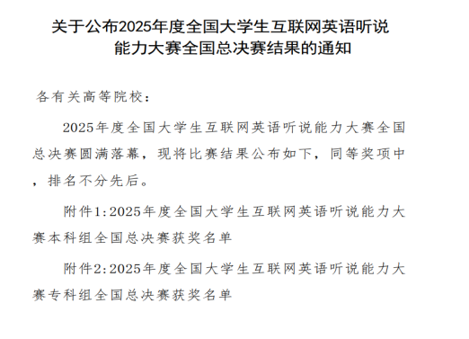 (通讯员 唐良玉)近日,2025年全国大学生互联网英语听说能力大赛全国总决赛获奖名单正式揭晓,我校学子曹也轩、张煜辰凭借扎实的英语听说功底、良好的临场应变能力荣获国赛三等奖。