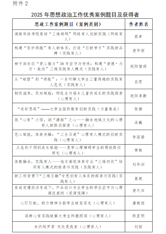 根据《关于评选2025年湖南科技学院思想政治工作优秀论文、优秀案例的通知》相关要求,经自主申报、学院推荐、专家评审、学校审核,拟评定欧阳智超等15位同志提交的论文为2025年思想政治工作优秀论文、蔡卓等15位同志提交的工作案例为2025年湖南科技学院思想政治工作优秀案例,现予以公示,公示时间为2026年1月18日-20日。如有异议,请在公示期内至学生工作部实名进行反映。地址:行政楼103室。
