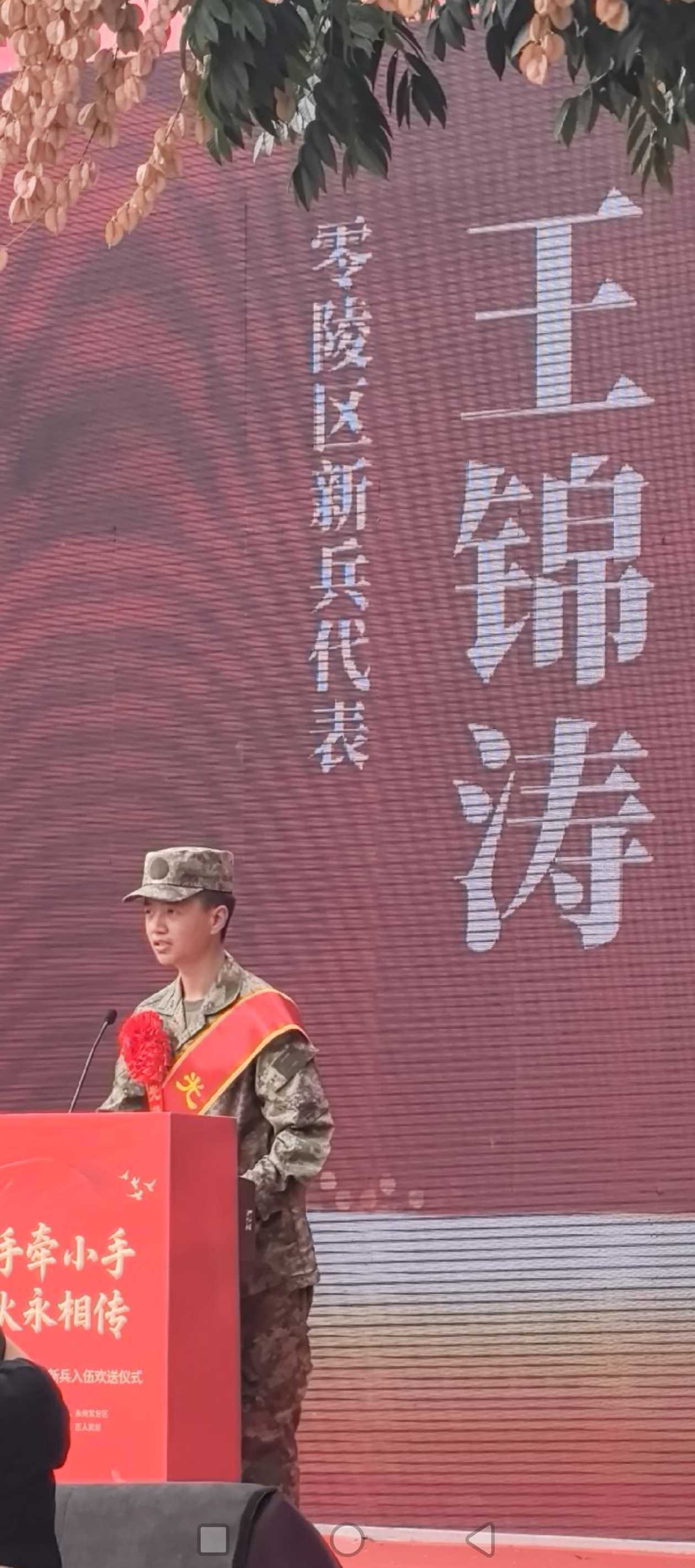 王锦涛同学自入学以来,始终怀揣军旅梦想,将“携笔从戎、保家卫国”的信念融入日常学习生活。他不仅在音乐专业领域勤学苦练、扎实钻研,还积极关注国防教育动态,主动参加学校组织的征兵宣讲会和国防主题教育活动,提前了解入伍政策与军营环境,为参军理想做足准备。9月12日,他在永州市于红六军团临时指挥部纪念馆举行的新兵入伍欢送仪式上,作为新兵代表发言,以铮铮誓言表达报效祖国的坚定决心。