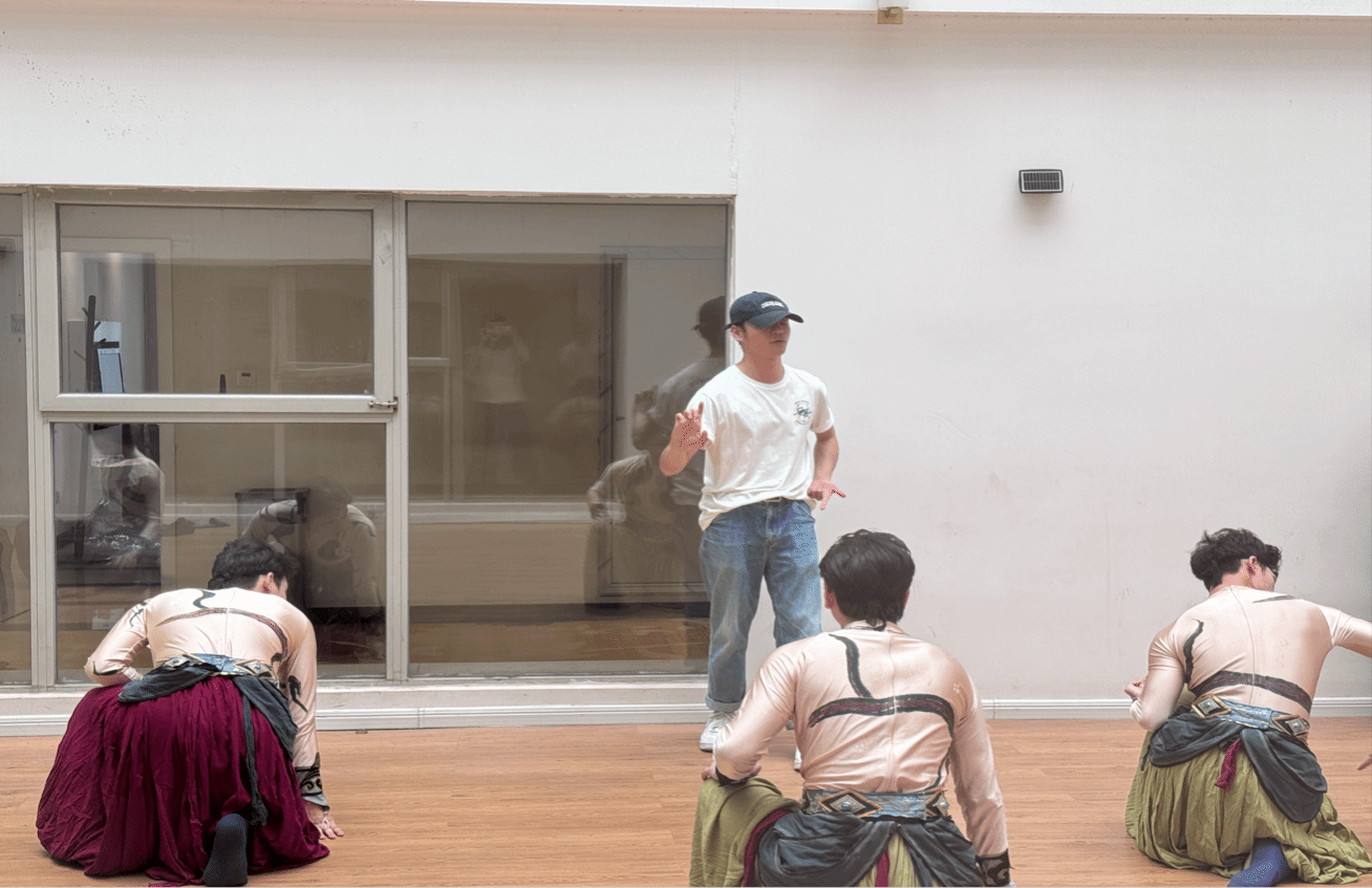 《铅华·满壁》以敦煌壁画为灵感源泉,将千年壁画的灵动神韵与现代舞蹈语言深度融合。自2024年9月起,22名舞者便开启了“淬炼之旅”,他们以“从零到精”的执着,从课堂延伸至课下,累计排练时长超800小时,用汗水浇筑舞台光芒。团队突破性别平衡的创作壁垒:男舞者承担了大量高难度托举动作,累计承重超过5吨,以力量与默契再现了壁画中飞天与力士的刚柔并济;女舞者则精研敦煌舞特有的“足尖捻转”等技巧,以细腻的肢体语言勾勒出敦煌艺术的灵动之美。为达到0.3秒级的动作同步精度,舞者们反复磨合每一个细节,从呼吸节奏到肢体幅度,甚至眼神交流都力求极致,最终让壁画中的“铅华”在舞台上焕发出新的生命力。
