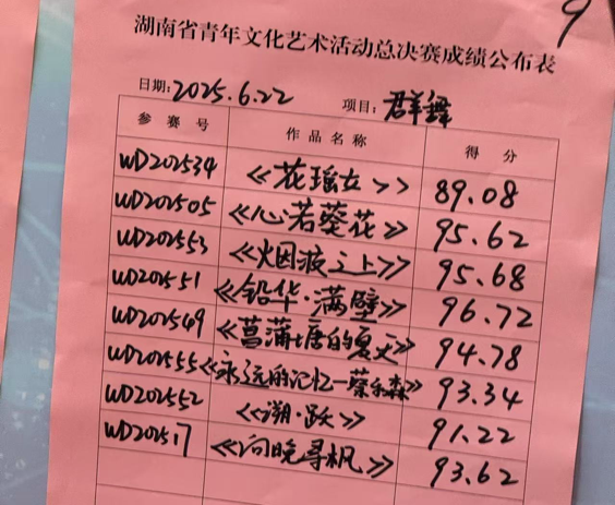 本网讯(通讯员:闫倪)近期,由共青团湖南省委、湖南省教育厅、湖南省科学技术厅共同主办的第十一届湖南省青年文化艺术节群舞总决赛在长沙举行。湖南科技学院音乐与舞蹈学院舞蹈系2023级学生演绎的敦煌主题群舞《铅华·满壁》凭借出色的艺术表现,以总分96.72分荣获金奖(第五名),载誉而归。