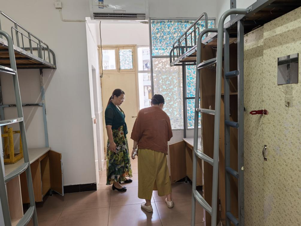 本网讯(通讯员 陈昱竹 李乐)为确保2025级新生顺利入住,营造安全、整洁的住宿环境,9月17日上午,副校长郑银芳在音乐与舞蹈学院党总支书记陈玉皎和学院相关人员的陪同下,对桃园四栋、七栋学生公寓检查宿舍设施及迎新准备工作进行细致地检查。