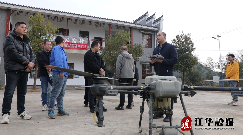 在伍家寨村村委会,湖南科技学院“小微型智能农机装备及应用”重点实验室负责人王林惠正结合当地山地果园特点,讲解无人机在植保作业中的应用优势、操作原理和维护方法。讲座结束后,进行无人机现场实操演练。