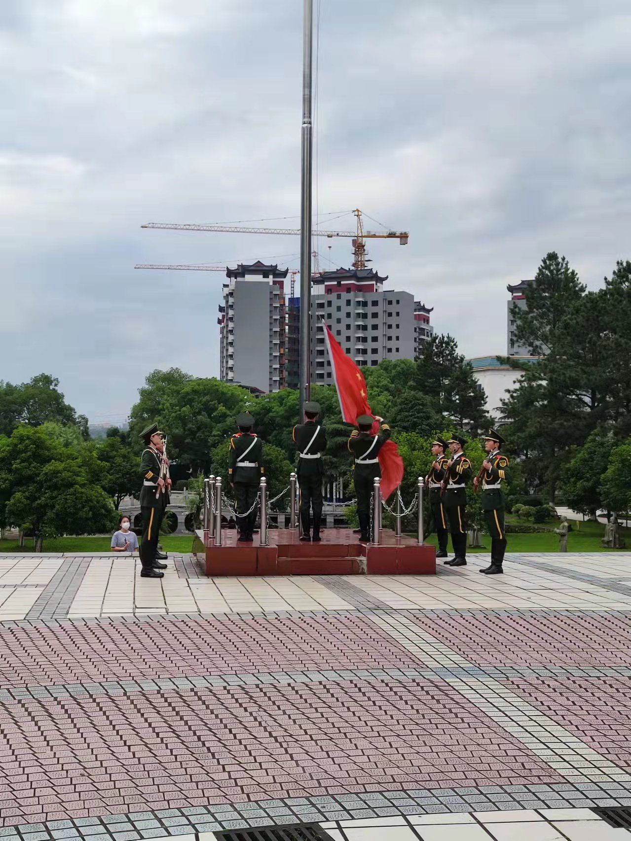 6点50分,升旗仪式正式开始,国旗护卫队护送五星红旗入场,随着《义勇军进行曲》的响起,全体师生齐唱国歌,面向五星红旗,行注目礼。