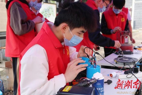 3顶帐篷、6张桌椅,还有提前置办好的电阻、电容、发热管等维修用具,青年志愿者们正在有条不紊的摆摊设点。