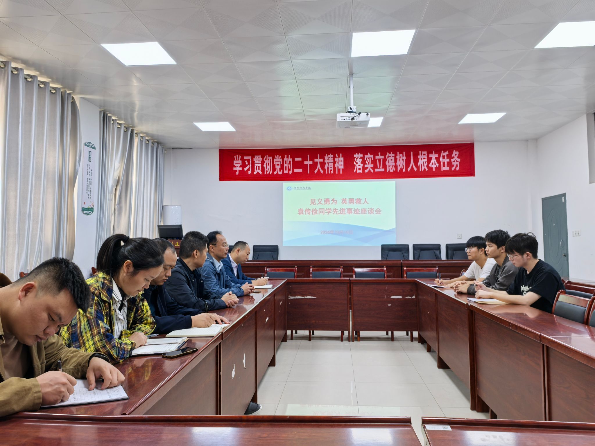 会上,学院党总支书记杨攀对袁传俭同学“见义勇为,英勇救人”的行为和事迹给予了高度赞扬,表扬他用实际行动诠释了当代大学生的责任与担任,为社会传递了正能量。院长谭永宏为袁传俭同学颁发纪念品,鼓励他继续努力,发扬好“德才兼备、自强不息”的校训精神。袁传俭同学感谢学校、学院和社会各界的赞誉,表示将弘扬见义勇为、乐于助人的精神,尽自己所能服务他人。参加座谈会的学生代表纷纷表示:“袁传俭同学的事迹原来只是在电视上看到,现在照进了自己的生活里,真实的发生在了自己的身边,让人震撼。他是班级的骄傲,我们将以他为榜样。”